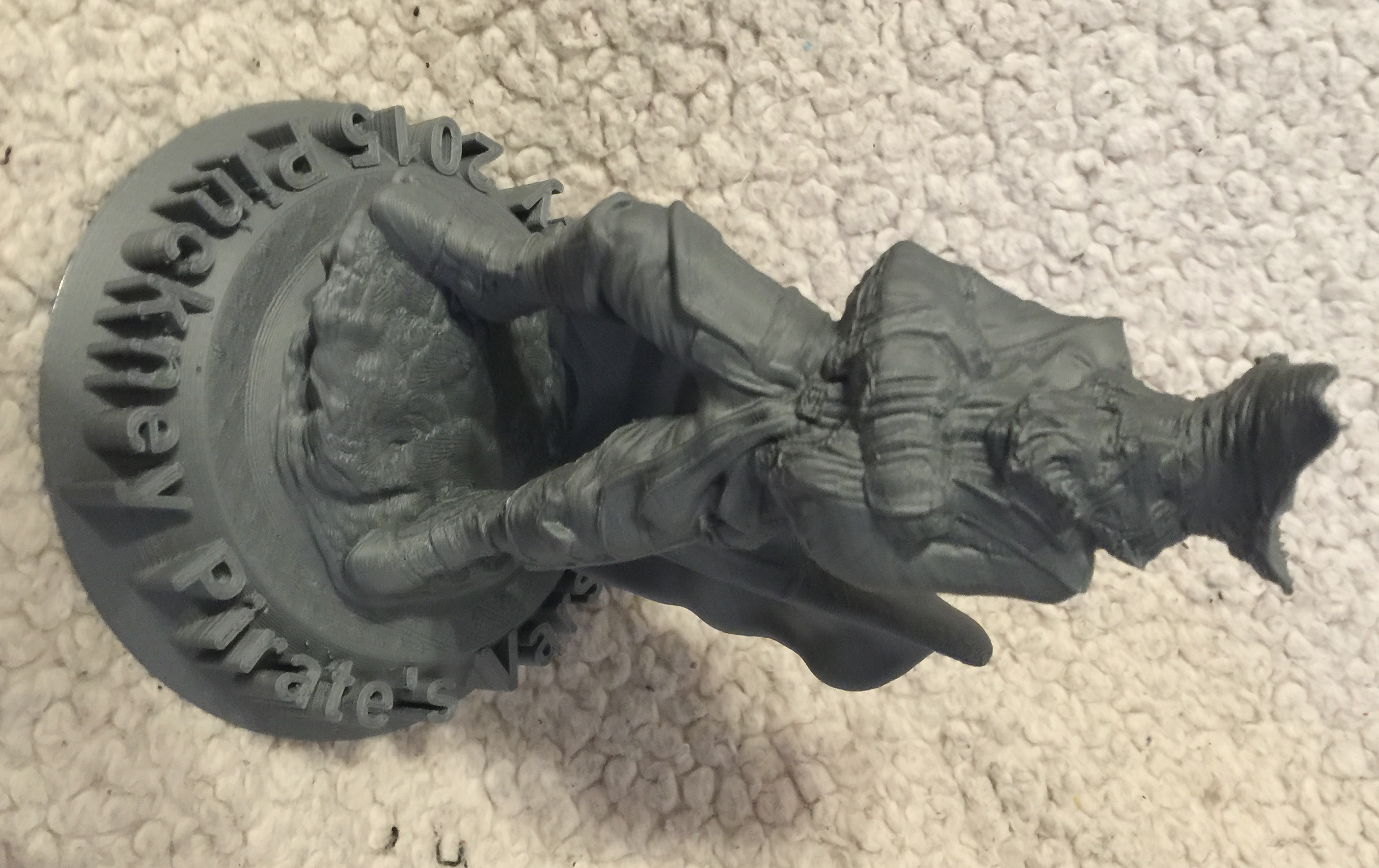 I based this on the PlunderBuss Pete Pirate (https://www.thingiverse.com/thing:144775) and then added the bases I modeled in Solidworks. Sharpie on the letters works great. The big pirate is about 8" tall and took about 8 hours. The Seniors like these reminders of their Varsity Hockey years. All PLA ...