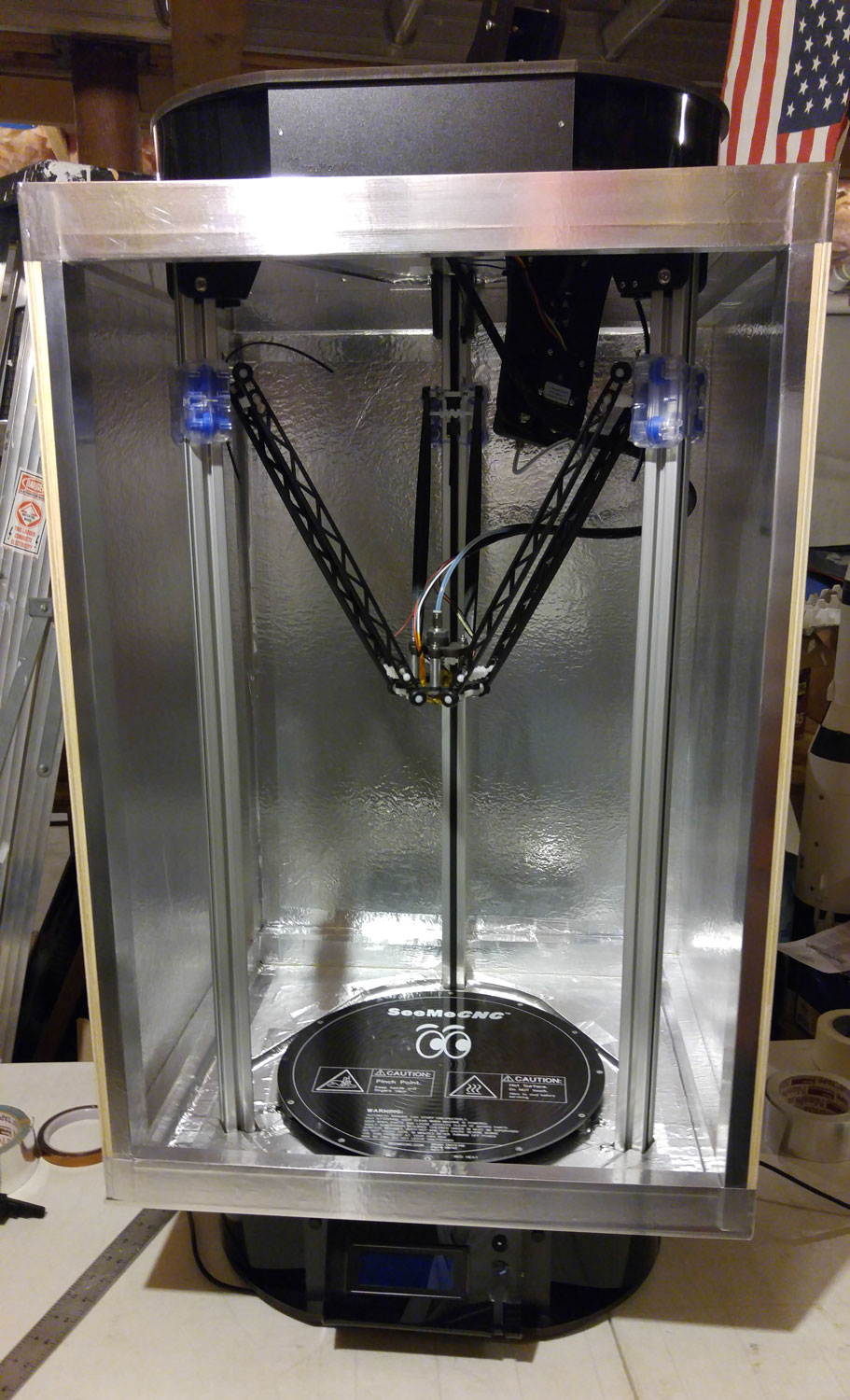 I built and documented an enclosure here: http://forum.seemecnc.com/viewtopic.php?f=35&t=9706 Pros for this design: 1) capable of achieving fairly high chamber temperatures, as aluminum surface + wood structure is very effective at containing heat. 2) economical, total cost < $150 Cons for this ...