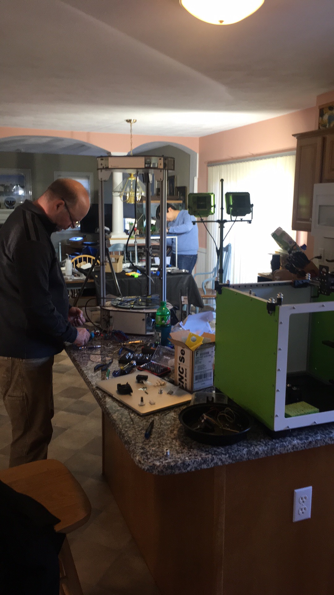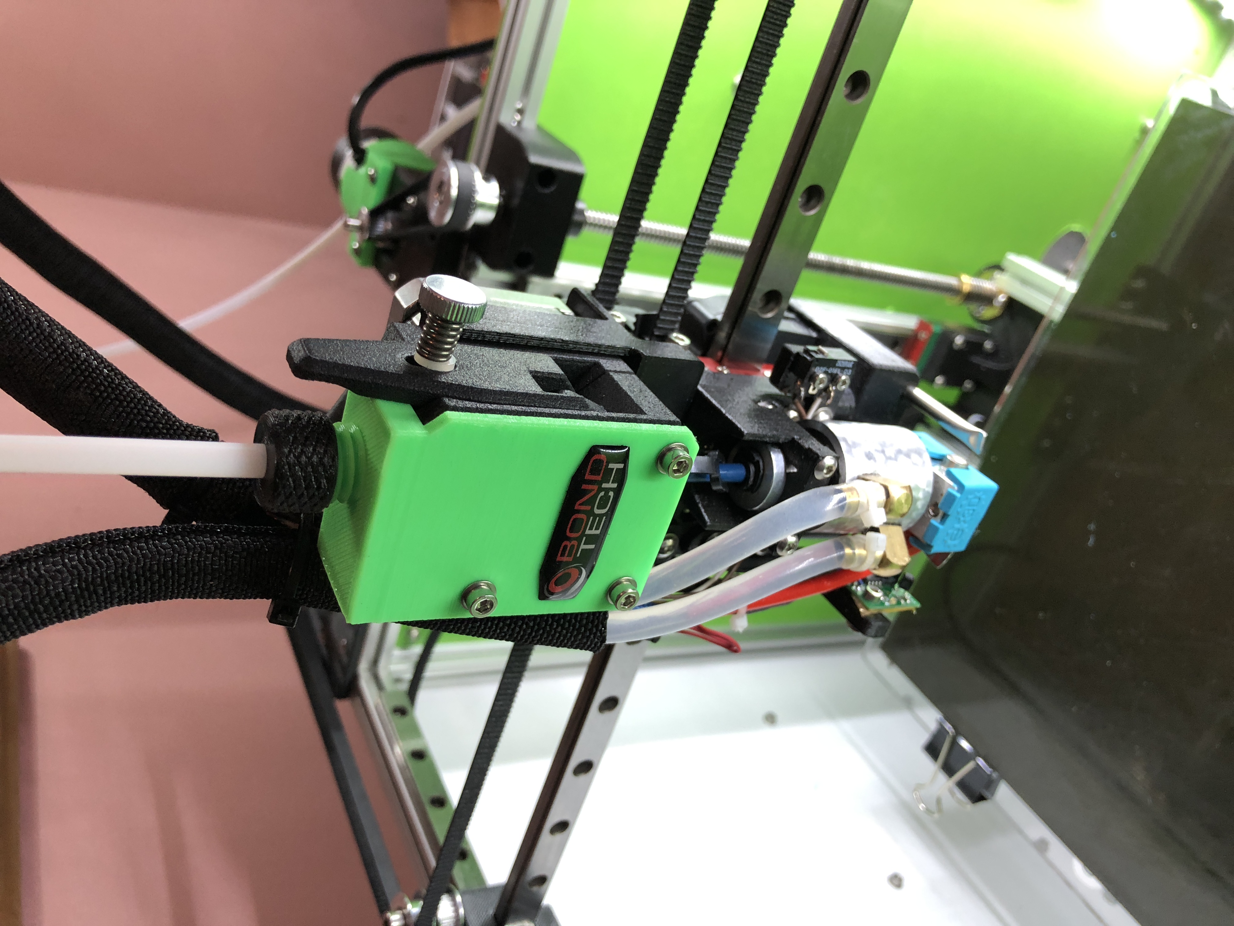 I hosted a couple of sessions in my kitchen for RailCore builds and as you see in the photo, a friend doing a Duet Wifi, Trick Laser arms, and Bondtech BMG upgrade to his RMax V2. I painted my aluminum with PlastiDip spray cans in Sublime Green (I kid you not), white and a black bottom. The results are really nice. And of course it gets my logo on the back. Here is the awesome base plate that Matt at 713Maker machines for the RailCore. Superb work: and my custom water cooled V6 hot end: Palette+ tubing mount The specs are:
