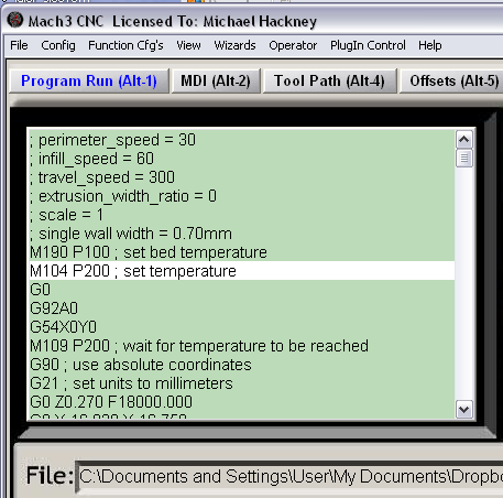 Operations Manual. I've been doing that too since I noticed a big variation between my orange, blue and green ABS with respect to extrusion temperature. It will be very useful to be able to capture extrusion temperature too and have that set in Mach. However, if you enter the temperature and bed temperature on the Printer and Filament tab in Slic3r, it will output the M codes to the gcode file. You can then look in the gcode display and see what temperature you need to set as you can see here!