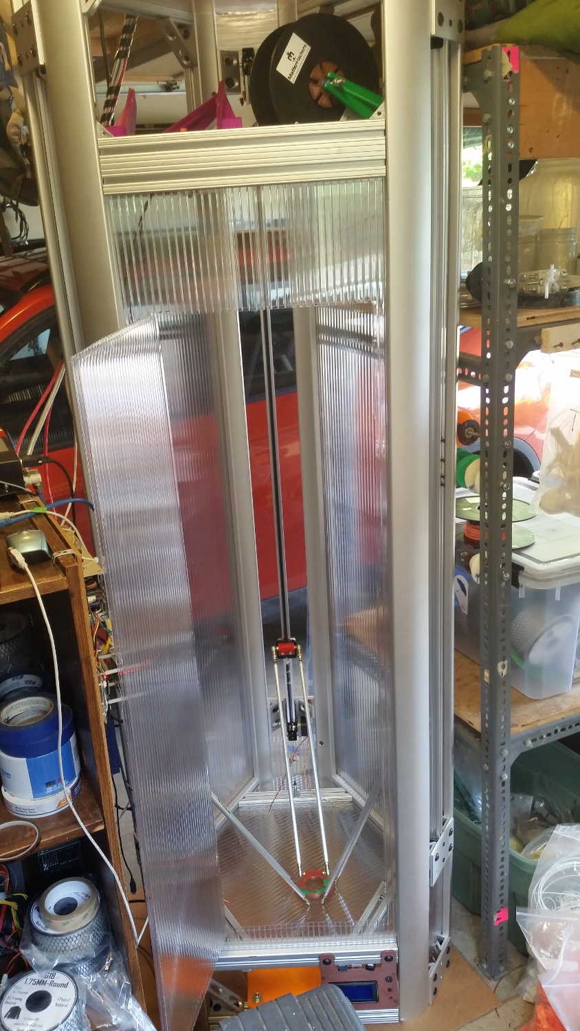 So after plenty of time with my two delta printers (RostockMAX v1 and SpiderBot) I felt the need for a bigger one. Having designed my own replacements parts for most of the machine (other than the frame) I decided to go for my own design from scratch because its more fun that way. My goals were big, rigid, accurate with a chamber, and not too crazy expensive, or heavy on custom manufacturing. I like 8020 but didn't know of good options for 60 degree corners until I found 40-4096... At this size I don't trust plastic vertices.