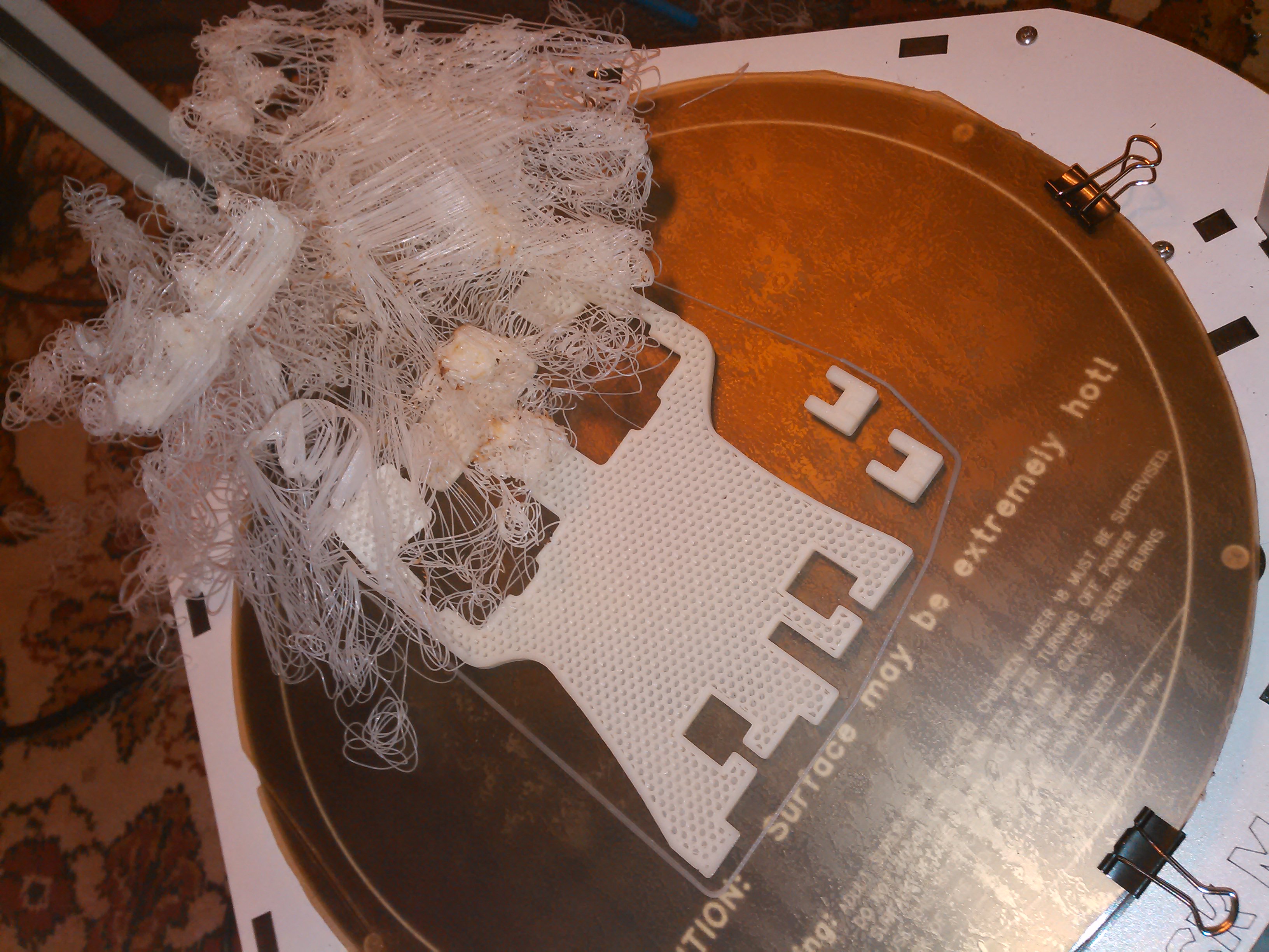 PEI, 90 Celsius build plate, without aluminium/copper plate under glass. Every corner has been warped up, and looks like one of them has been warped more than others, and catch the nozzle. I was not wathing all printing process (it was 8 hours), just first 20 minutes, thats result: