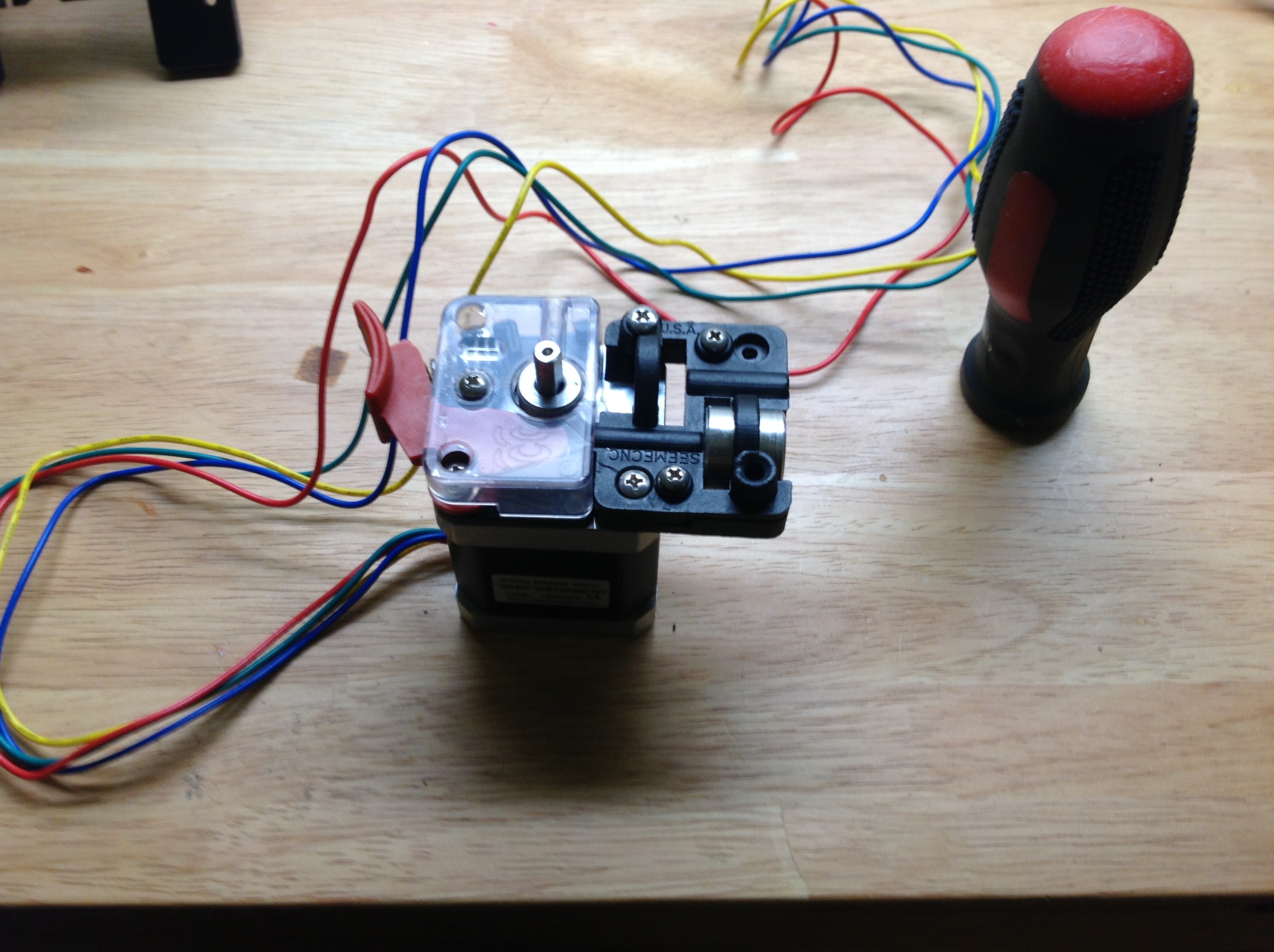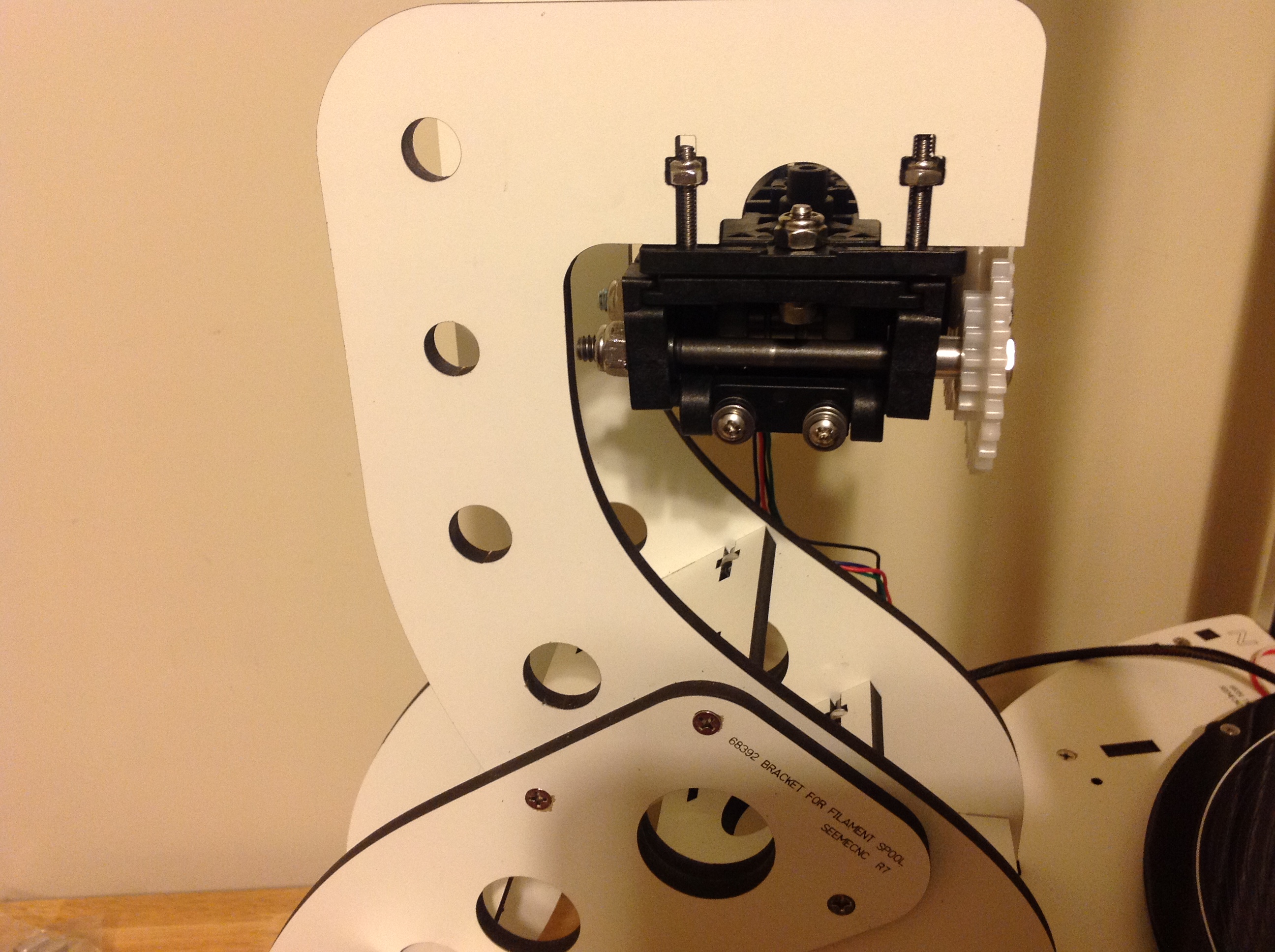 Got the extruder put together, the arms and carriage done, and the cheapskates. Now I'm fishing wire down the rails for the limit switches.