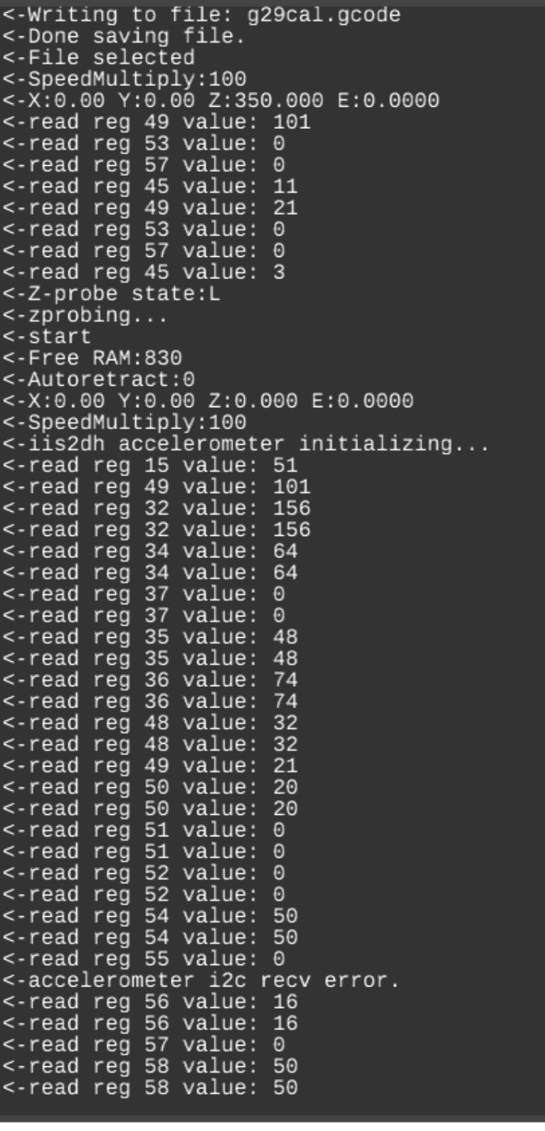 When you first connect to your printer, do you get a listing in the terminal something like this? (presumably indicating good communication with accelerometer).