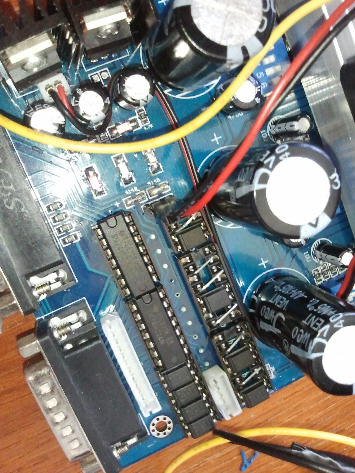 So I replaced with some solid core wire and no change... Also I tried putting the chips back in and no change... Only the X axis is responding... What am I missing what else could cause this...? I am on deadline to get this project done so any other ideas are really appreciated... the glowing red lights to the left of the opto chips are they all supposed to glow when everything is on because the two direct beside where the diodes i removed and bridge the contacts are not glowing but the rest are...?