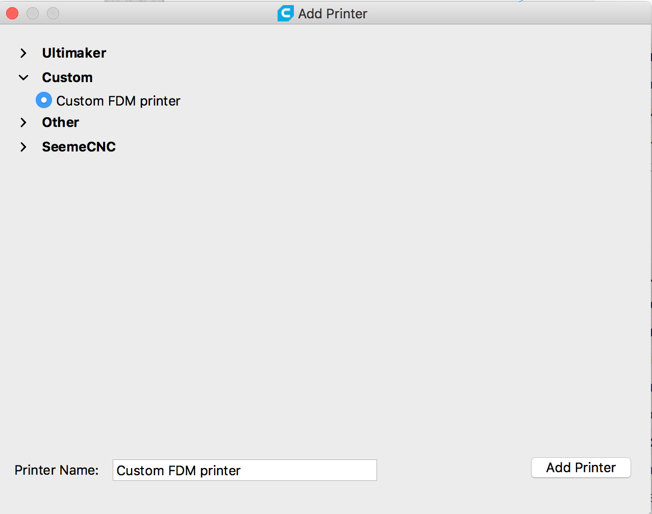 5. Start up Cura and select the Rostock max v2 from the printer select screen