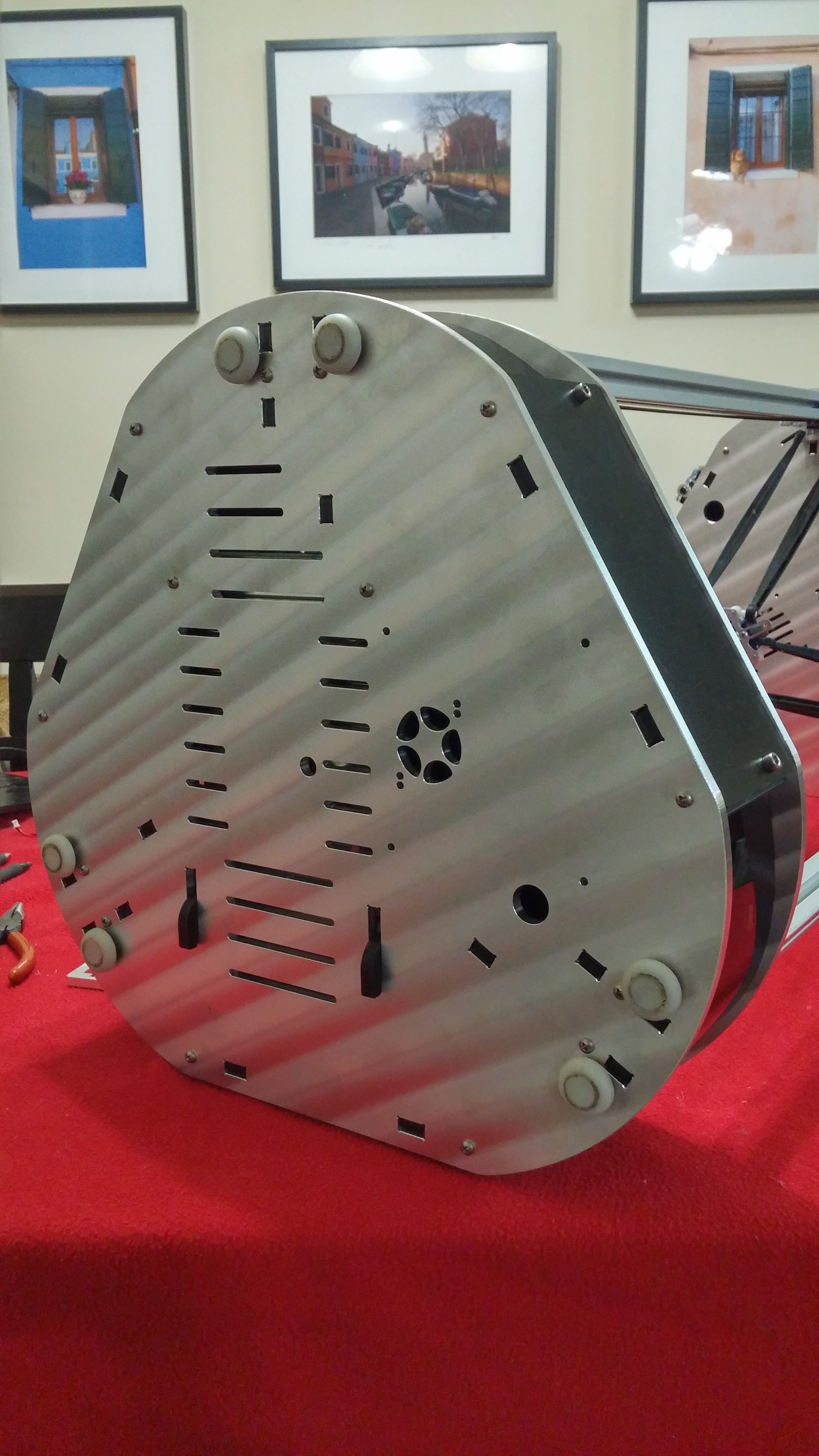 OK here is a sneak peek at the first prototype for the V3 metal frame set. Tomorrow I will look at wiring everything back up and start test prints. Still need to also lay up the custom composite fabric side panels and vacuum resin infuse them in the next few days then mill them down to replace the plex. Still finishing up the enclosure in CAD and ordering the poly panels for that in a few days. They SHOULD arrive in time for the faire at the end of the month if I get them ordered in the next few days. Will update more shortly. Below are a few rough snaps with the cell to tide folks over until I can throw up the studio and get some good shots done. In early Aug. I will get started on the full 100% metal build on the V2. But really not looking forward to tearing down my V2 for that project, it is a rock solid printer and I am not looking forward to taking it apart since it works so darn well. Sure it will be just as good after, but never easy to tear down a great working printer.