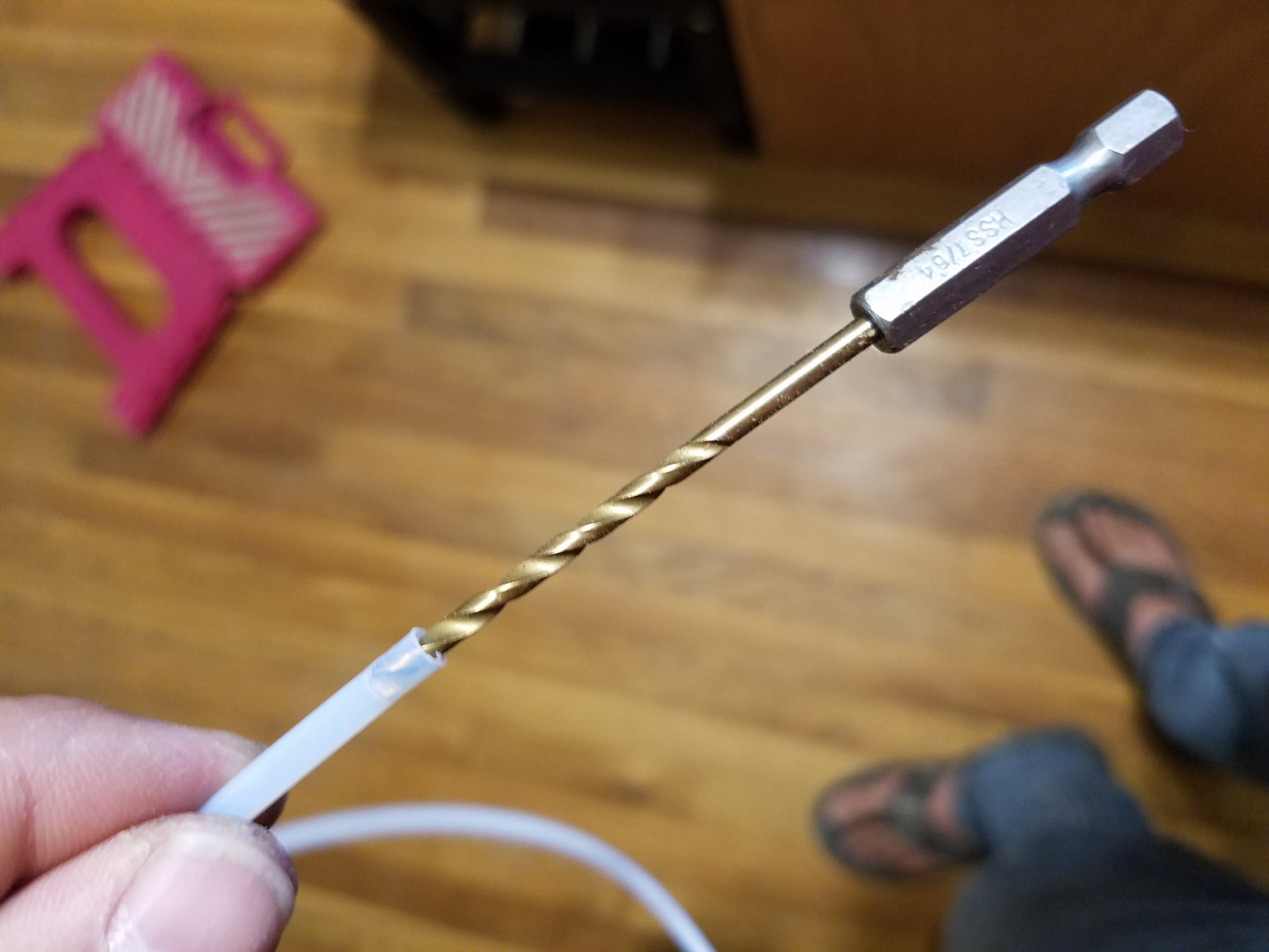 The image of the drill bit was my way of performing the chambered edge on the bowden. I can make the wall thinner longer into the pfte tube, as well I can still make the 45 degree cambered easier than with a utility knife. I used several bits of larger diameter as I stepped the wall thickness down .