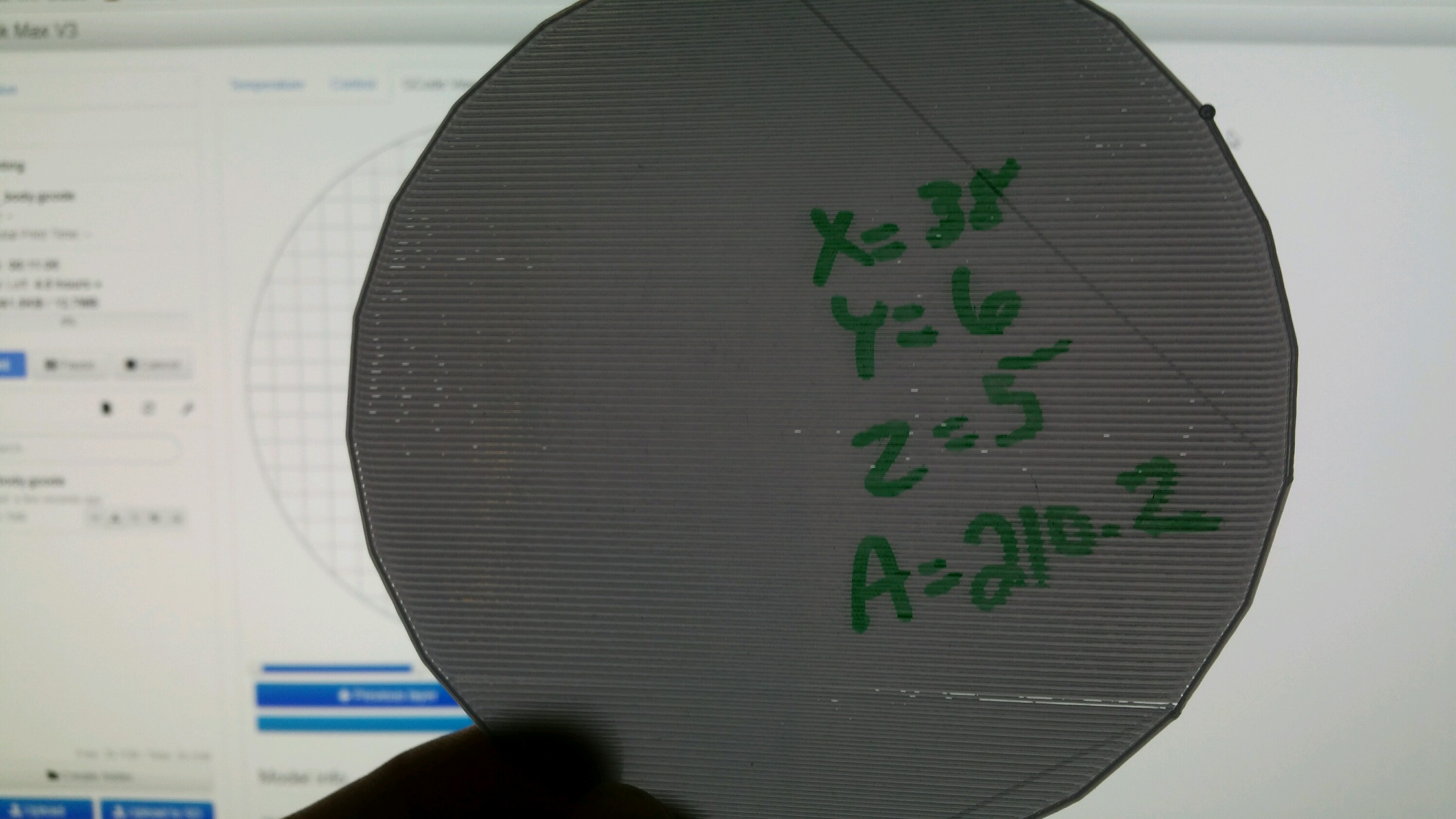 As far as my process with calibrating went, I ran the G29 once with Hackneys 135mm radius probe points (I'll Also include a photo of that at the end). Then I ran the wizard and wrote down the ten z-offsets and plugged them into the site. I took the complete list of new EEPROM settings from the site and manually entered them into my system. Then repeated this again on a warm bed (G29 and then probing) and arrived where I am now at about .03 deviation. The only thing I had to manually adjust was the extrusion settings to ensure proper welding of the lines on the bed.