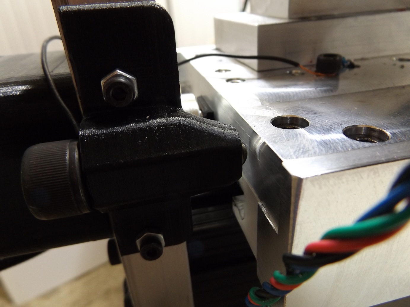 Also I should mention the driving force for each linear axis. I'm still using 1/2 inch leadscrews with a fast travel pitch in acetal nuts. The nuts are 3 inches long, and they're held in place by a light press fit to take forward and reverse forces as well as 7 M6 screws. They're adjustable for backlash by turning a SHCS from the back, which compresses the nut around its flexible bottleneck joint a tiny bit. The acme threads are tapped with the same leadscrew that they run on, which means backlash is near-zero without compensation. The adjustment screw is there for long term use, I'm guessing the threads will wear a few thousandths after months or years of use. I'll be testing this quite a bit.....For now I only know that the backlash is well under 0.001".