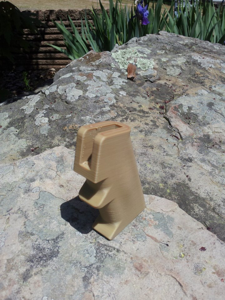 I've got my first part done for my new prototype laser tagger. I've printed a grip I found on Thingiverse. This was done in gold ABS with a .20 layer height and 100% infill. It took a under 4 hours to print, and weights 2 oz on the button. I'm really pleased with how it came out.