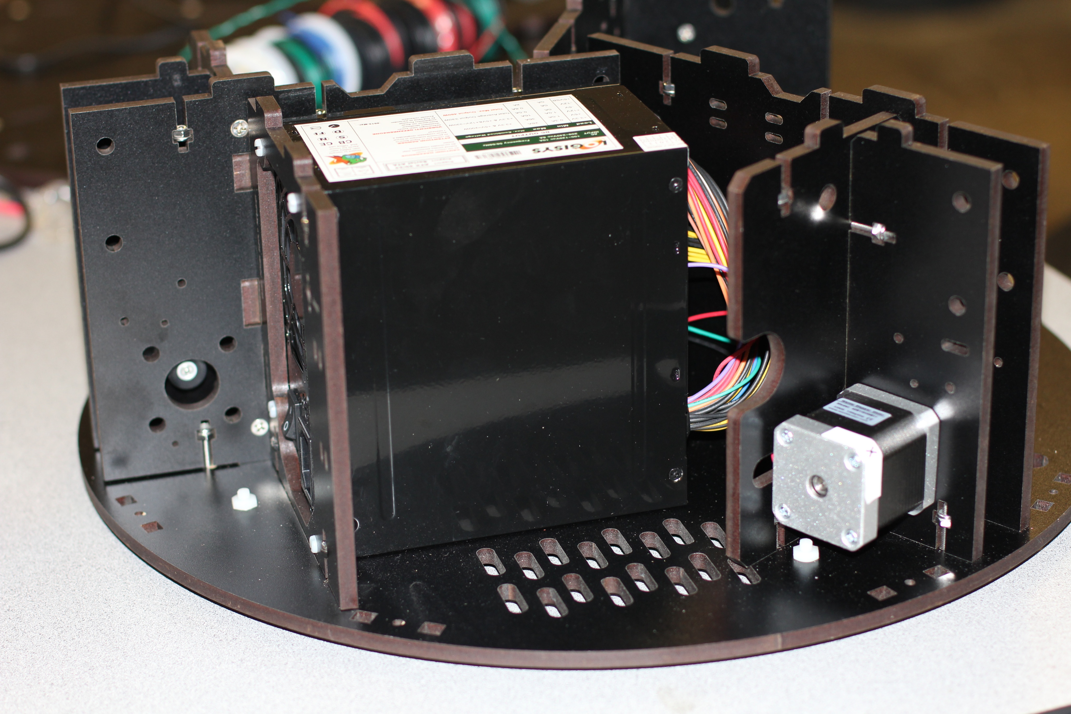 Here is the wiring that I did before closing up the base. I ran power to the motherboard, hooked up all three motors, and ran three wires out for the power switch. (Three? See next post.) The power switch wires are coiled up under the masking tape in this photo.