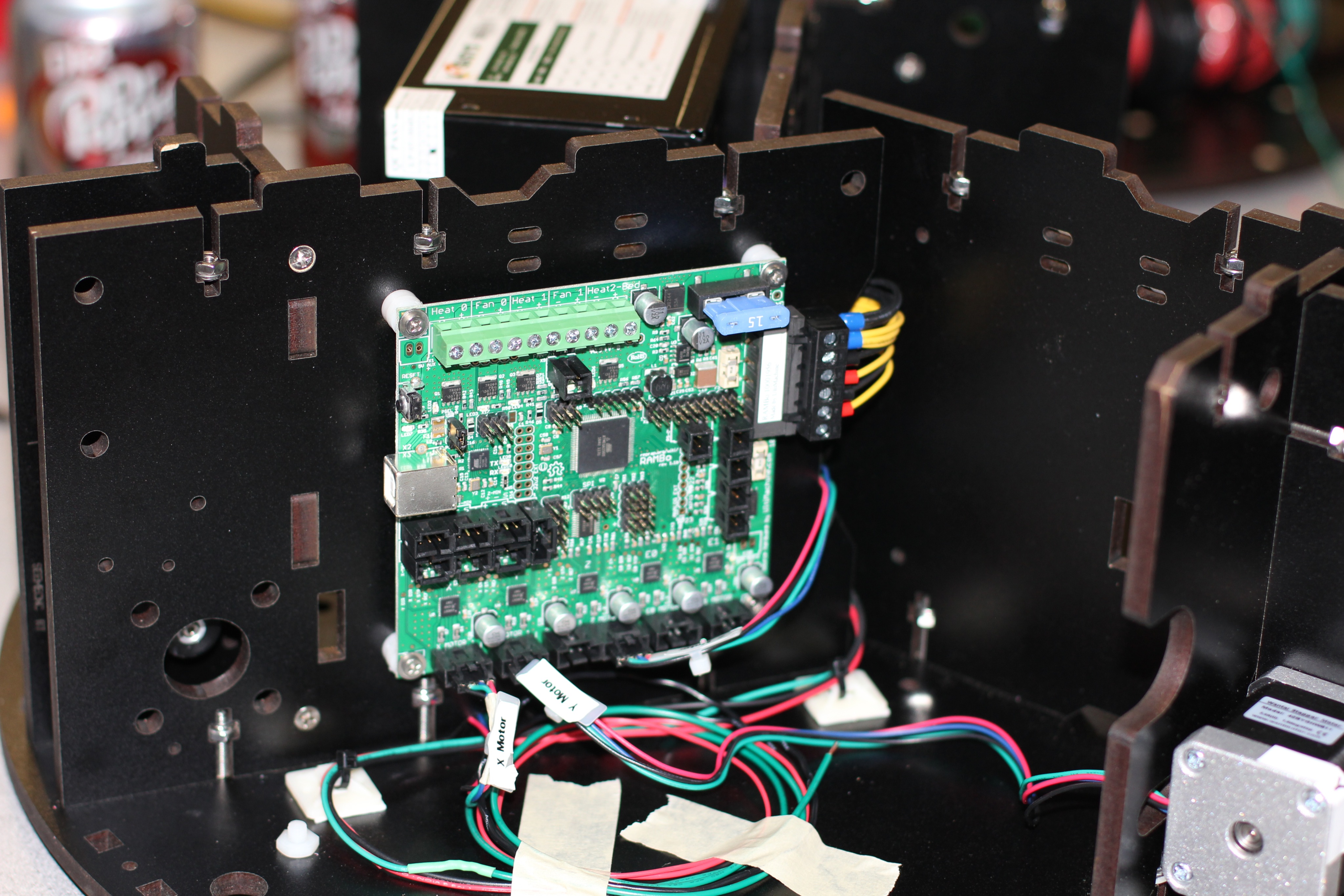 • I can trim the motor wires to match the actual distance to the headers on the RAMBo. I'll leave about two inches of slack in each. That's cleaner than leaving big coils of extra wire. I'll also trim the power supply wires with maybe 6 inches of slack.