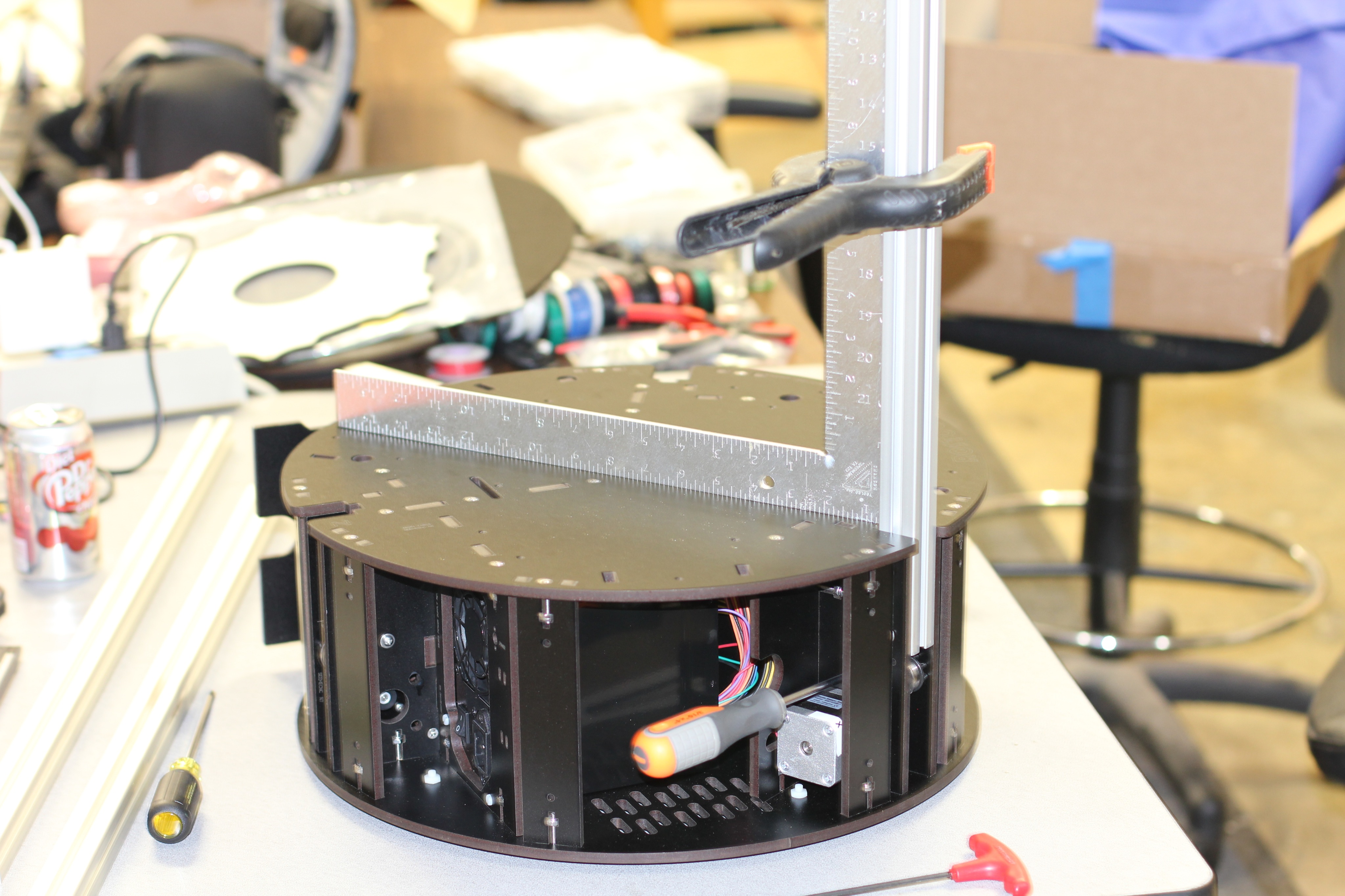 I assembled the "snare drum", the base assembly, last night. It took about 15 minutes to get all the panels aligned to put the top piece on. But I got it. I torqued all the screws to "4" on the electric screwdriver's meaningless number scale. That was the lowest setting that would pull the tabs all the way into the slots. Then I ran a straightedge over all the screw heads. Those that stuck out, I hand-tightened until the straightedge wouldn't catch on them.
