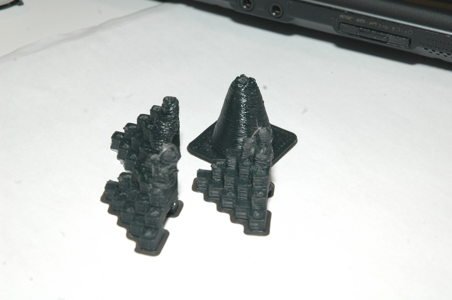 Basically, if I'm printing an object that has a pointy top where the hotend will have to stay in the same area for a long time, that area overheats and turns to mush, like in your pictures. But if I print two of the object at once, then the hotend will have to jump away from the problem area, letting it cool off a little. If you're using Kisslicer, it has an option called "prime pillar" which has your printer build a small hollow cylinder off to the side of whatever you're actually trying to print. This serves the same purpose of making the hotend jump away from your overheating model. This is really handy, especially when you don't have two things you want to print at once.