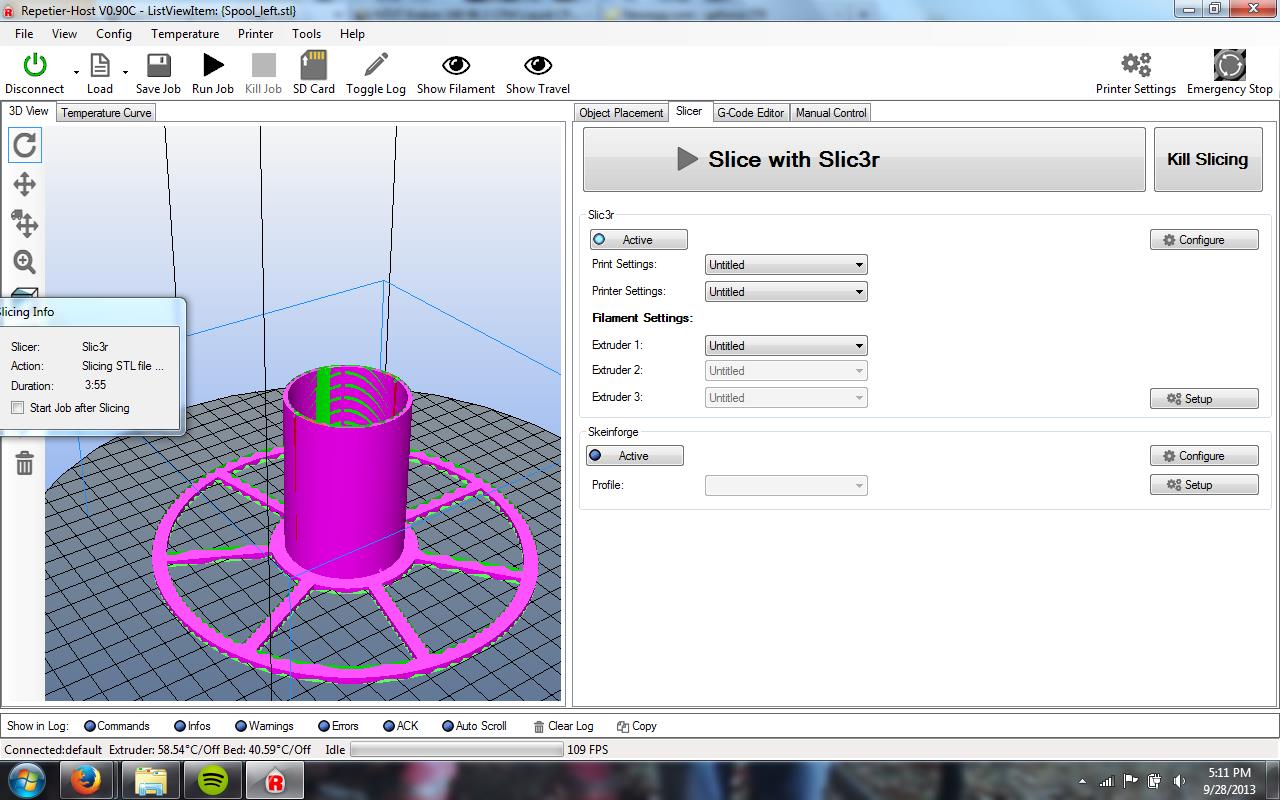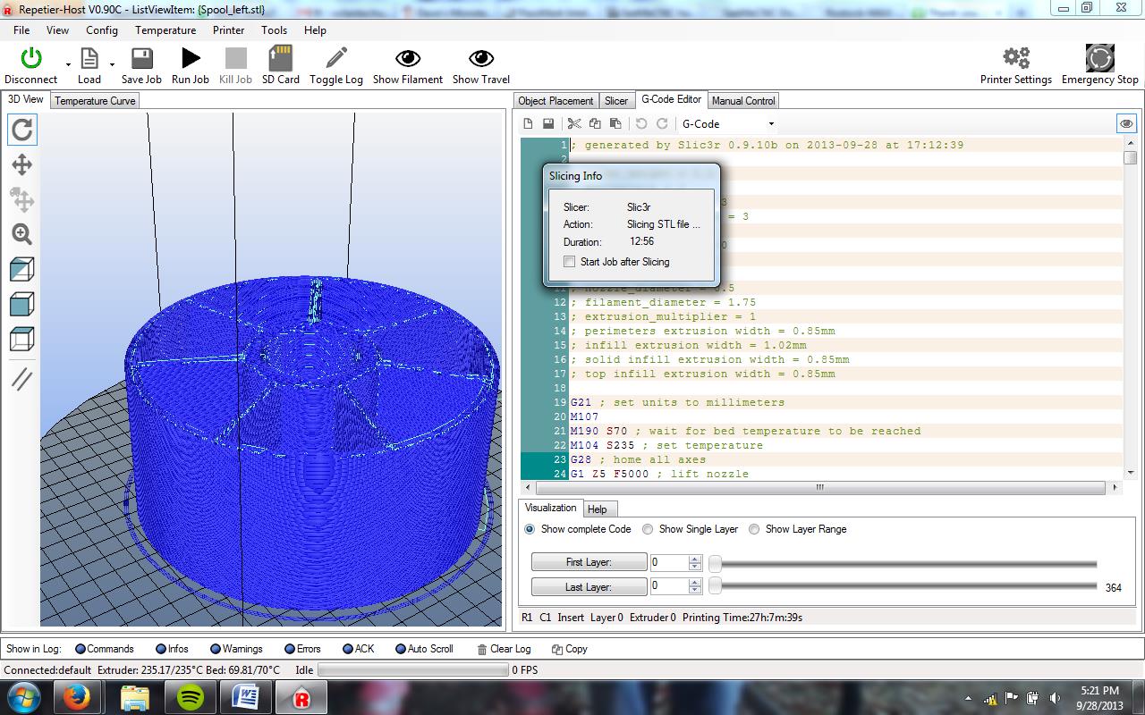 Attached are a few pics of some slicing I've done to show what problem I'm having. I downloaded the rostock material spool from thingiverse, and it gives these results when I slice it. Any idea what is happening? I believe my settings are pretty normal, I tried playing with the infill etc etc to no avail.