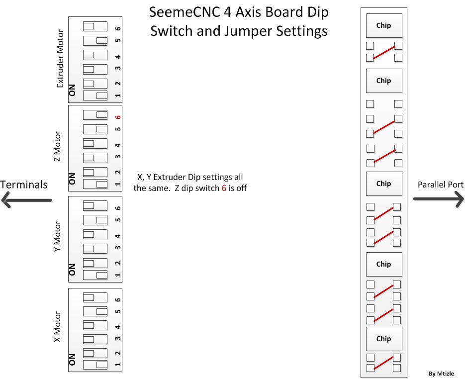 4 Axis Board Dip switch and Jumper Settings Diagram. Settings were taken from photo found on this post by Seemecnc admin. Would it be alright to use solid core wire for the Jumpers? Looks like you used some kind of staple or solid core material. Edit - Diagrams Verified - Went ahead and used 22 gauge solid core wire for Jumpers, added a pic of my finished board with Dip and Jumper settings.
