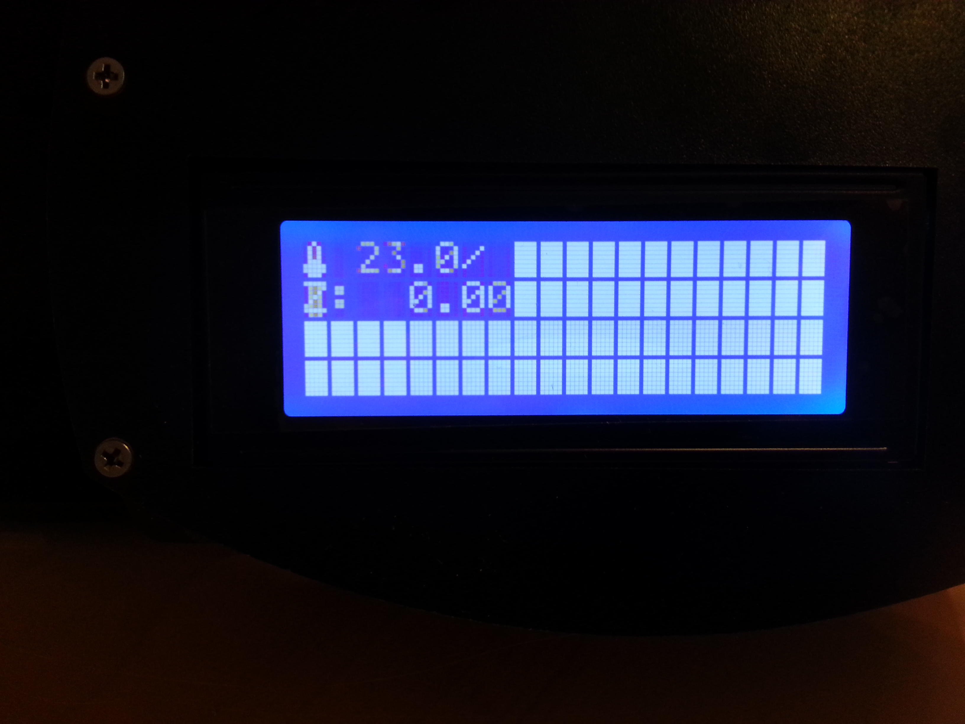 I build the Rostock max. At the start the LCD was working. After a few days, just after the calibration process, the LCD stopped working. I checked the fuses, the flat cables, uploaded the firmware, the adapter board. Everything seems to be ok. About two days ago the LCD was working again for a few hours and then suddenly stopped working. I only see a few characters on the display and they are changing during printing, so that part is working correct. See also attached picture.