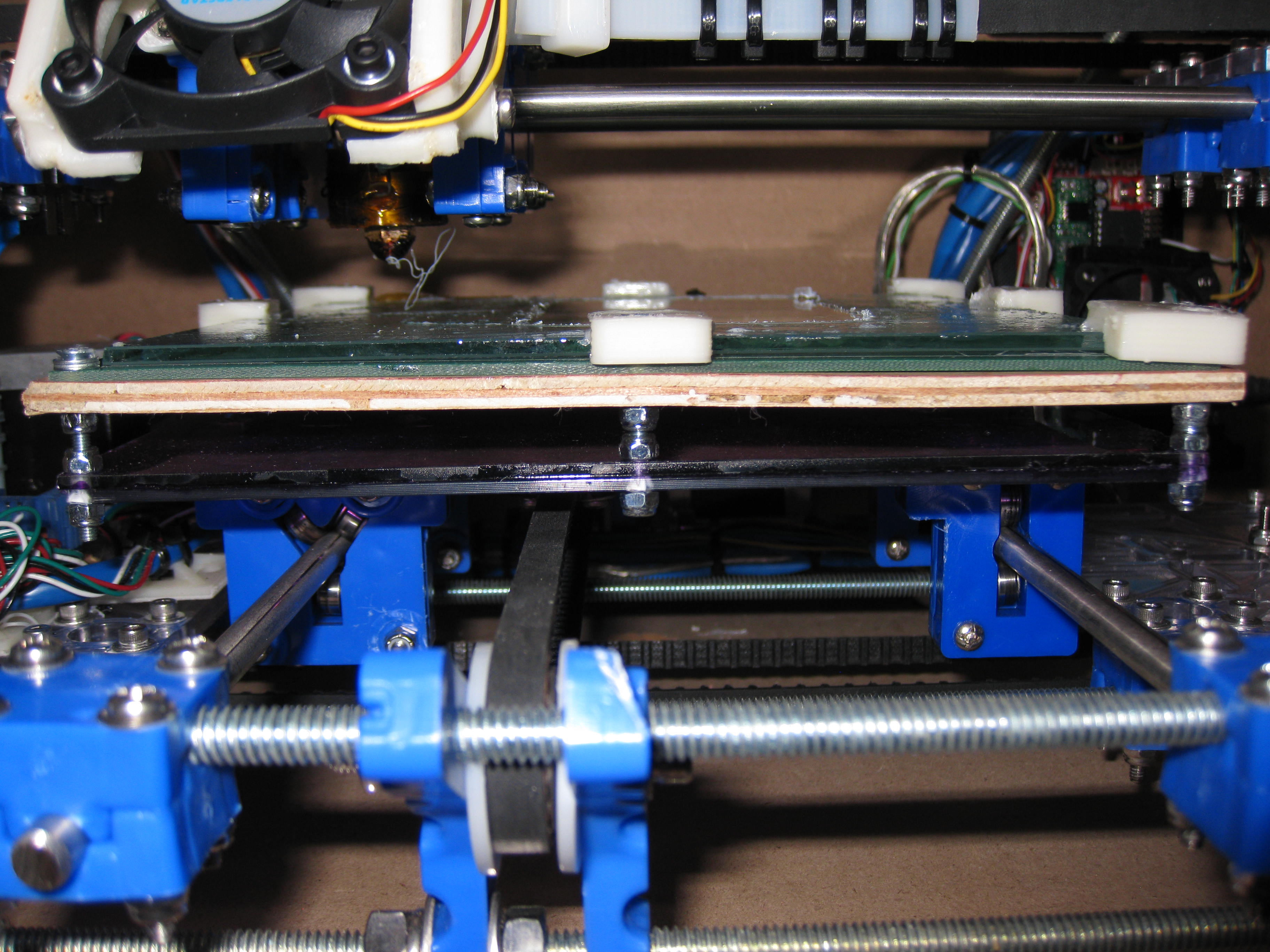 The bed was thickened to provide rigidity, I just glued another 1/8" plexi-glass plate to it, that's what the purple is, ABS/PVC cement.