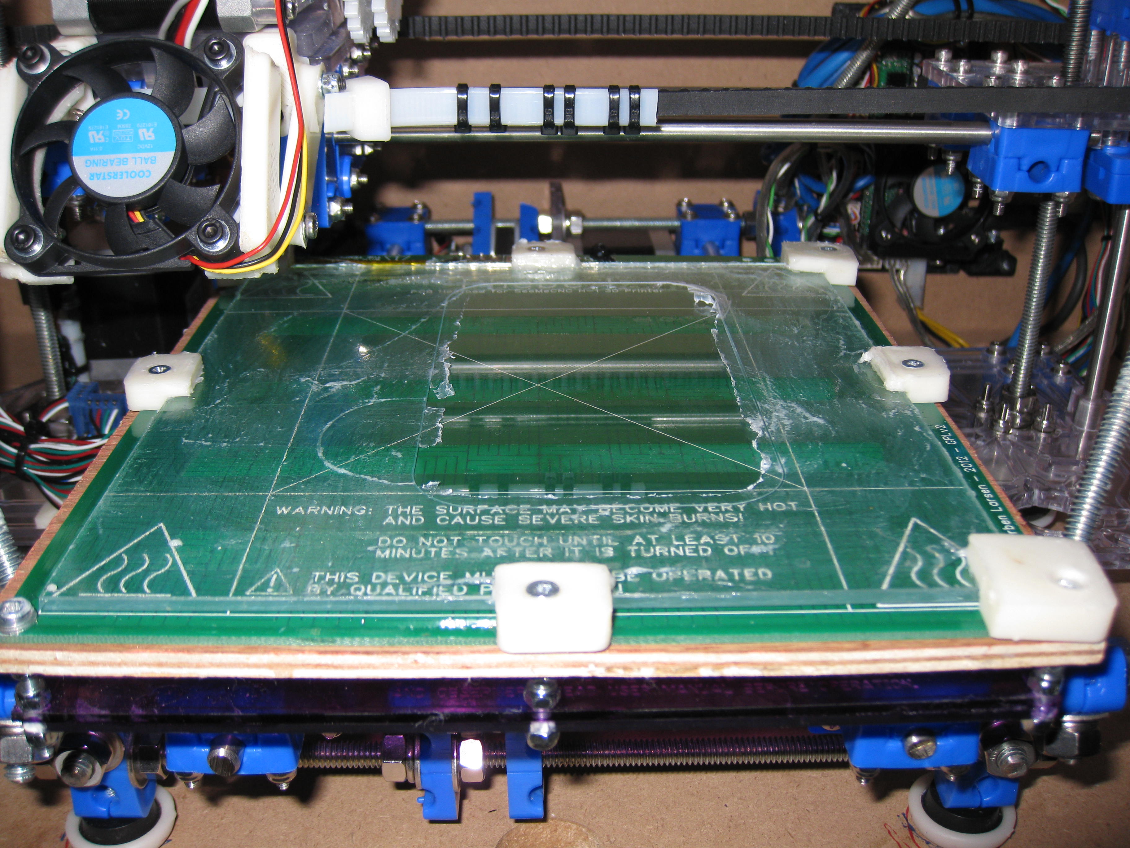 The front left plastic glass retainer was left off because the extruder tip homes there.