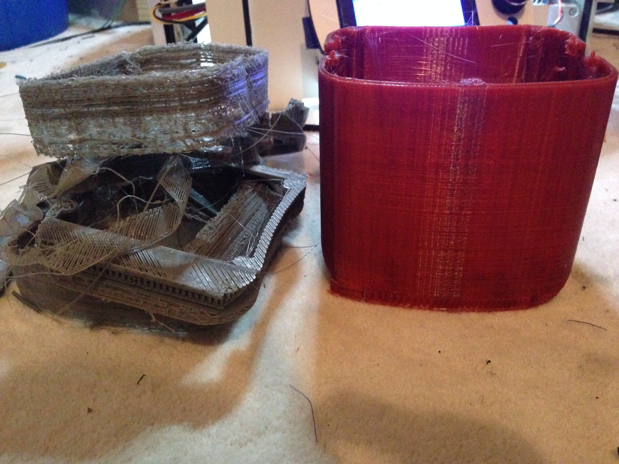 After an entire weekend of hearing "tat, tat, tat" and knowing that it means a failed print is imminent, I cringe just reading it. I'll snap a photo later this evening. Room temp stayed fairly constant. And the printing environments (heat bed included) were identical between the red and grey prints. mhackney- have you tried all the filaments you purchased from the vendor you bought that red pla from? I am pretty sure we order from the same vendor.