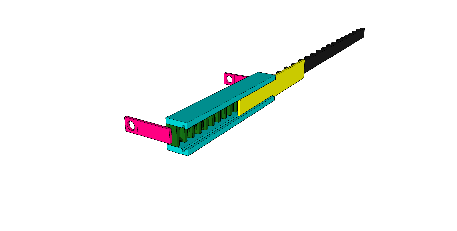 The 2 green parts are glued together, then the 2 blue sides are added. The Yellow part slides in to keep the timing belt in place. Im thinking to add a nut/screw in the center to keep the yellow slider from coming off during operation.