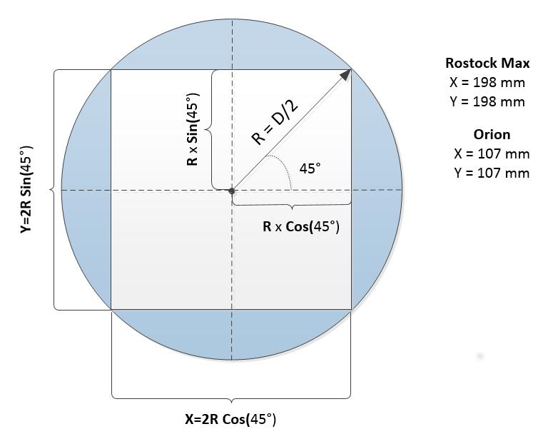 Anyway, these are the parameters I have for my Rostock Max; they seem to work fine. Before that, using X=Y=260 my large prints were caught "out of the bed". No good for the belts, they got bitten by the pulleys when the Cheapskates fell down hard!!! Here are the parameters that *should* work with Orion. I DO NOT own an Orion, so, I hadn't tested this values, so please, use caution the first time you go to the edges of X or Y. PS. The Z value, of course, depends on your actual height. I guess it is always the same value for Orions.