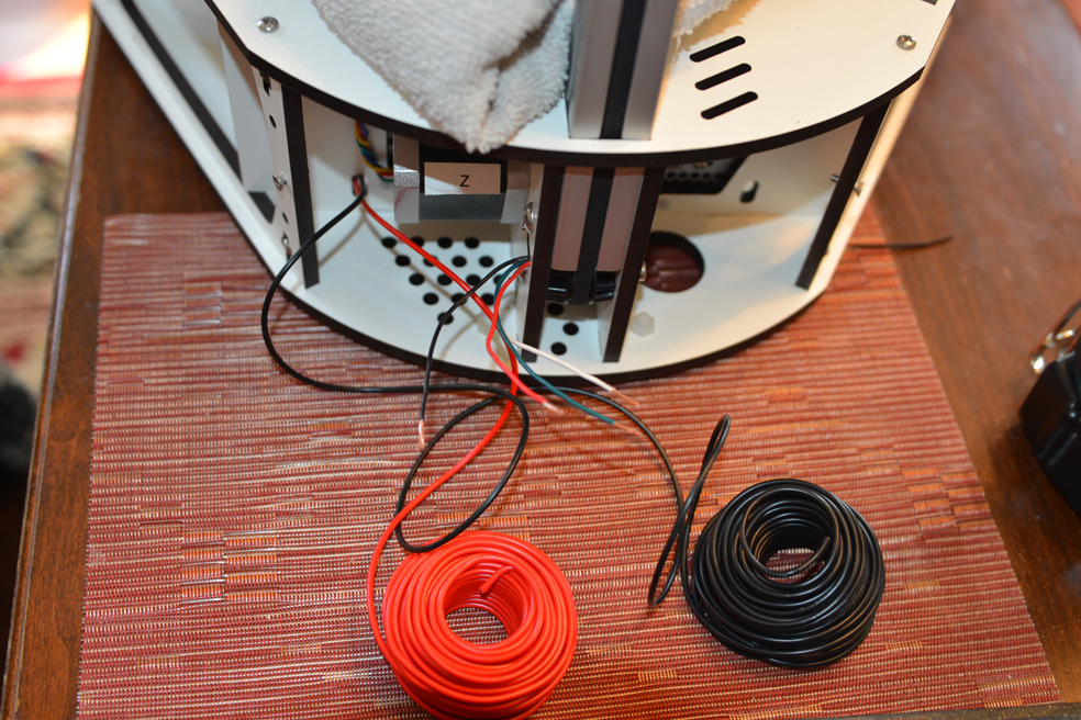 Threading the wires through the towers was one of the more difficult parts of the job. The wires are pretty snug and bind up about 2/3 of the way through the tower (all 3 sets got stuck). I tried twisting them as I pushed, but that didn’t seem to help any. I ran out to the garage and got a 3’ piece of wire (a long coat hanger might work) and used it to fish the wires through. Just push the fisher wire through and tape the printer wires to the end then using a combination of pushing the printer wire in and pulling the fisher wire out you can get the wires pulled through.