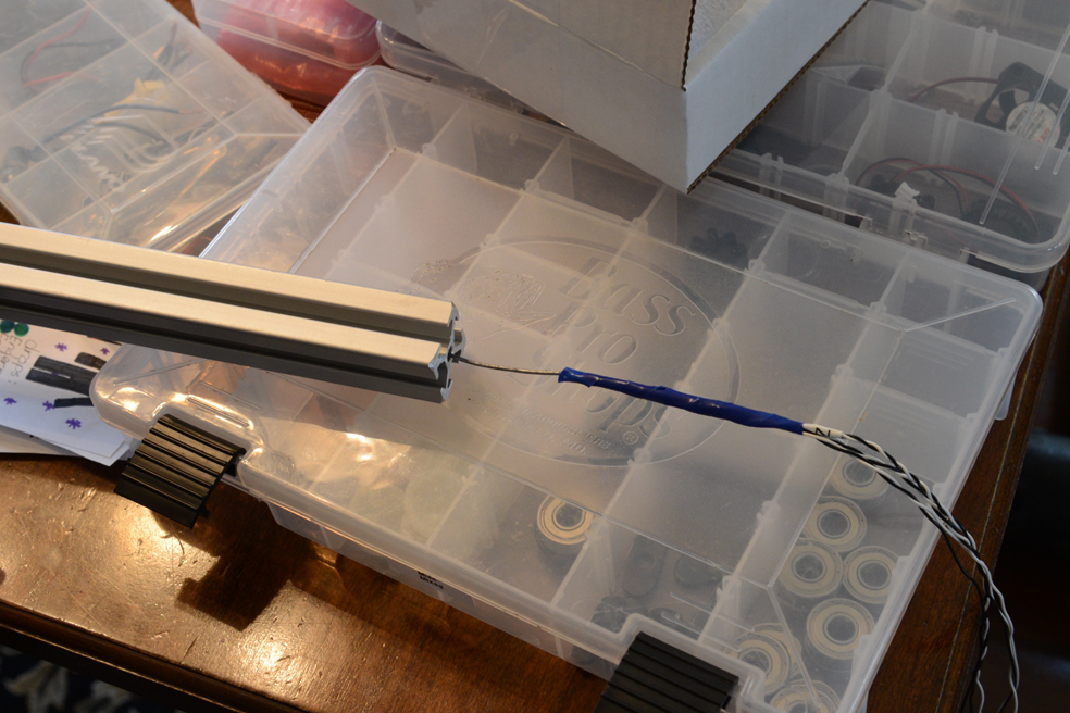 Threading the wires through the towers was one of the more difficult parts of the job. The wires are pretty snug and bind up about 2/3 of the way through the tower (all 3 sets got stuck). I tried twisting them as I pushed, but that didn’t seem to help any. I ran out to the garage and got a 3’ piece of wire (a long coat hanger might work) and used it to fish the wires through. Just push the fisher wire through and tape the printer wires to the end then using a combination of pushing the printer wire in and pulling the fisher wire out you can get the wires pulled through.