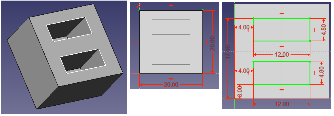 After printing several items from Thingiverse I thought I take a shot at developing my own using FreeCAD. Once the small USB holder was complete I exported the FCStd as a stl, opened it in Repetier-Host, sliced and printed it. On the upside, all 3 prints are very consistent but they are not even close to getting a USB to fit. They measure approx. 9.8mm by 3.6mm.