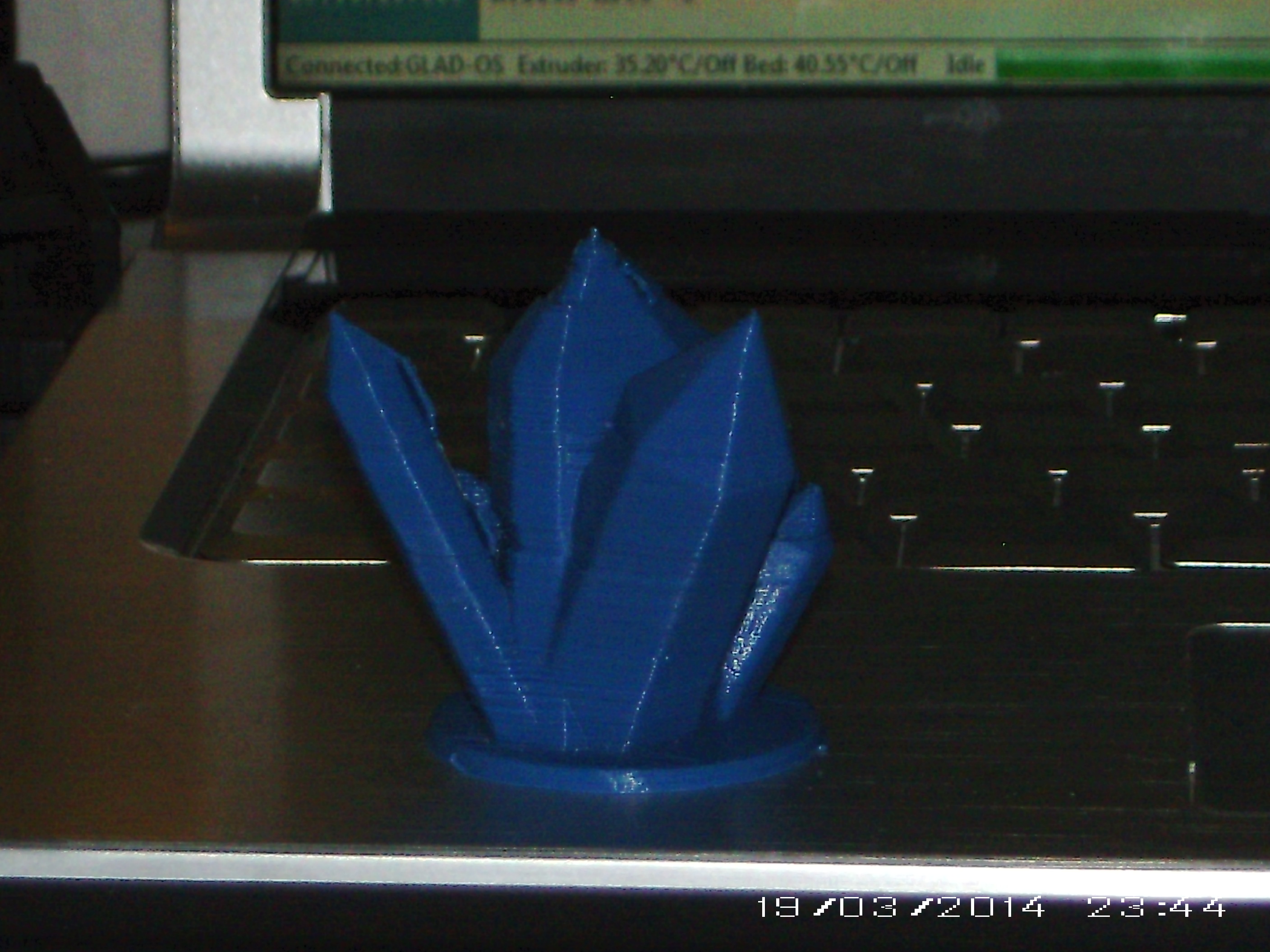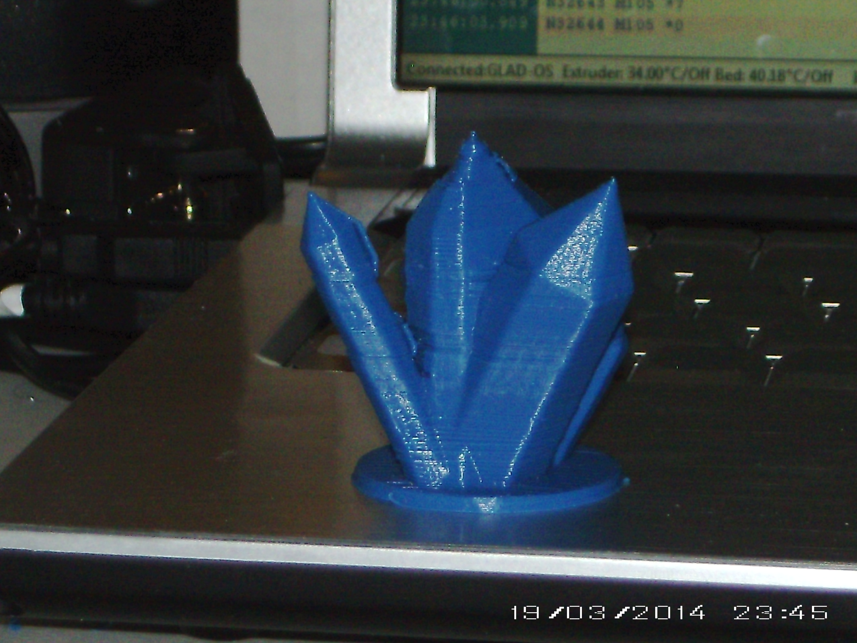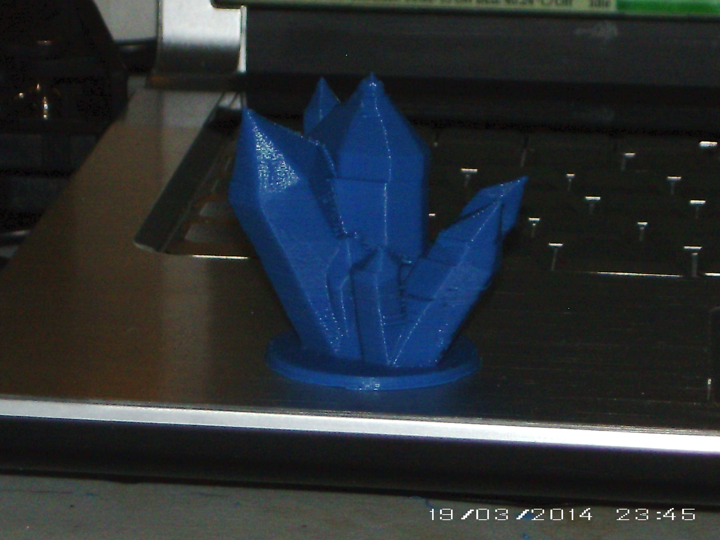 Well the wall finished, it has a line across the middle with very little plastic, and it actually broke in half long ways when I took it off the plate, easy to glue back together though. and it looks stringy.. The crystals worked pretty well for the first 30 or so layers, then one of the back ones is shifted about .5mm to the right, but went back to the original position near the top, and as it went up more of the smaller crystals were shifted to the right, but not all of them. I would have thought the whole model would have shifted of one of the pulleys slipped.