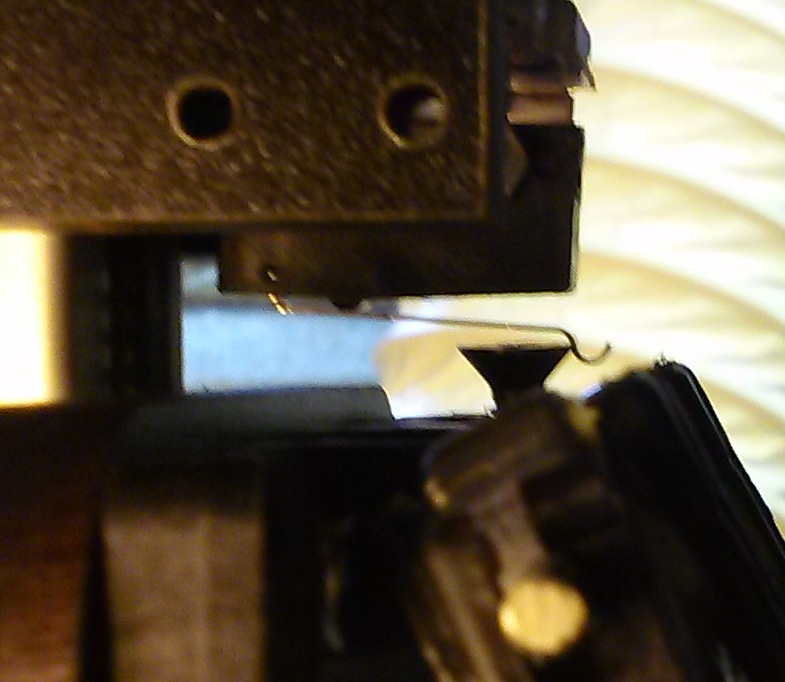 Factory end stop switch lever, installed, with end stop screw precariously on curve of lever