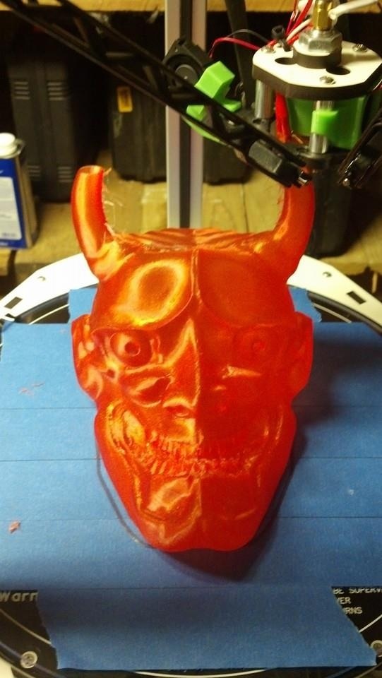 Been playing with cura. I like the results so far. This is a 1 layer thick hollow print in PLA. I have the spiral outer layer function turned on. It's also my first print since installing a new 40 watt cartridge heater and I love it. I am worried about a run away hot end situation due to its power but I'm working on limiting it. The mask would make a very nice decorative lamp as it's very thin.