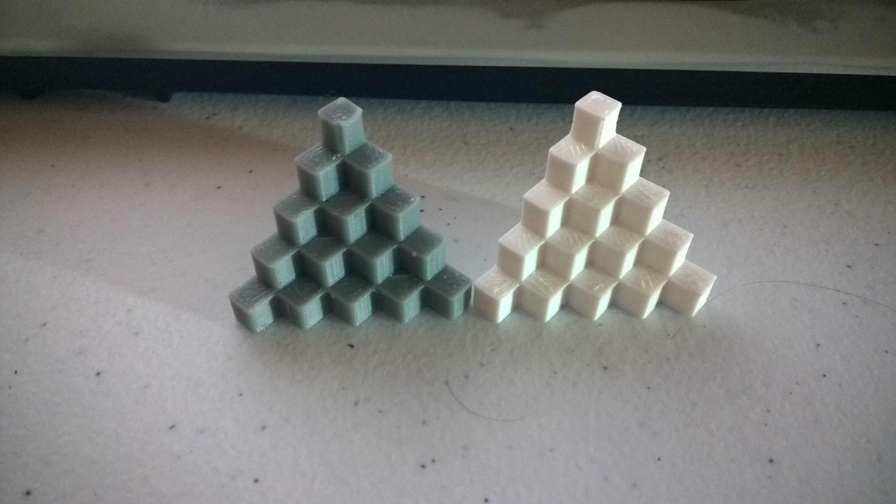 So, I saw, somewhere (probably reddit) that this company was selling high quality ABS filament and had a discount on it since they just introduced it and I decided to give it a whirl and buy some. Previously, I have been printing using Octave Grey ABS and most stuff comes out pretty good, but I've had some issues. So when I finally got this stuff unpackaged and loaded the printer with it this morning, I was amazed. First, the filament itself is much more flexible than the Octave. I was actually a bit worried that it might have some issues extruding, but there were 0. Second, the size of the filament is spot on. I pulled about 20 meters off and measured 1.75+-.01mm. I didn't have a lot of time this morning so I just printed off a quick 5mm step calibration cube. The only thing different between these two prints is the filament size. both sliced in slic3r, printed at 240C, and what a difference. The very tip actually came out square instead of slightly rounded, and the dimensions are much more uniform than the Octave filament, being low by almost exactly 1%, which is damn near perfect for ABS. The surface is also much smoother, which is not surprising considering the much smaller size variation of the filament. Here are some side by sides of the cubes.