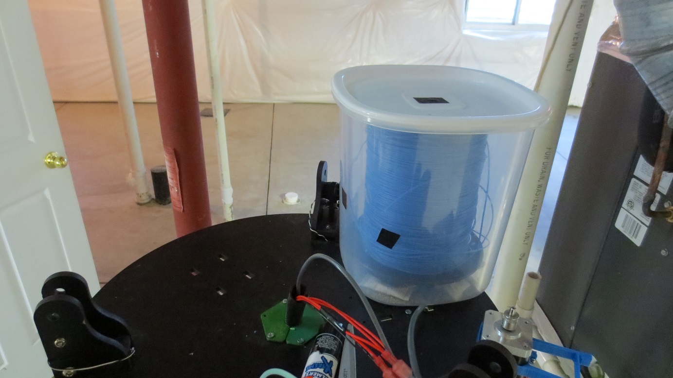 This type of food container works great for 3lb trimmer line nylon spools since they are taller and thinner than most ABS and PLA spools meant for 3d printing. Your setup looks a lot better than mine, and mine is sometimes a pain since I drilled the holes in the tub wrong and never perfected the spool idler. Mine is just 2 608 skate bearings in a printed turntable.