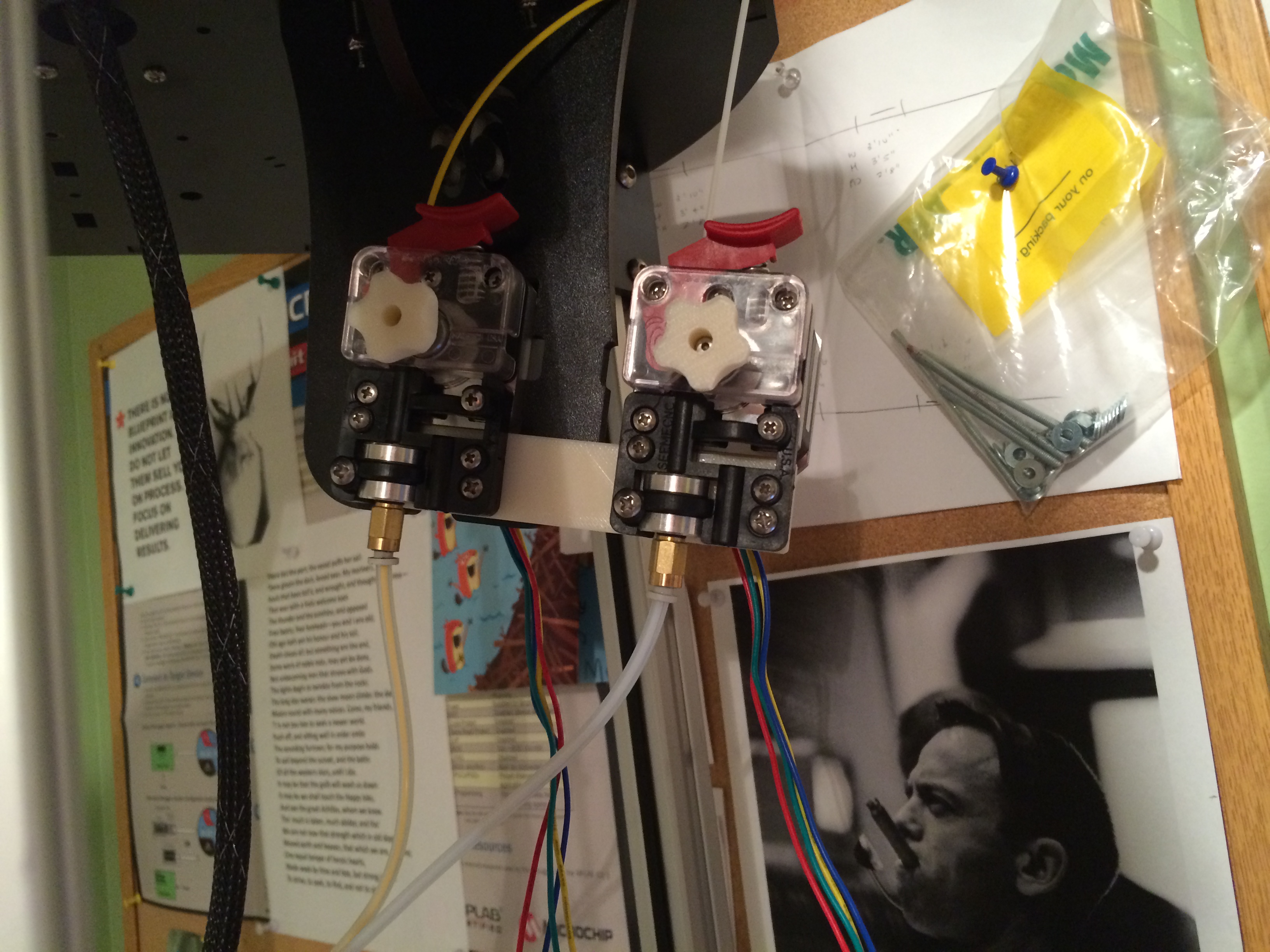This is a very simple and clever solution! I had been trying all dual extruder setup around with not great success. I mean, I had been able to print two colors, but with a looooong and painfull process of leveling the two nozzles every time. This is just ... easy!Justin@Saturday wrote:If you're interested, I can post the mods for the dual extruder through one hot end as well. It's just a couple of tiny printed widgets and you're up and running. Right now it's printing ABS and HIPS.