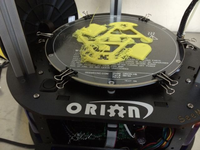 Anyhoo, I've had my Orion for four days and, though my first print (this same part, Kossel Mini plate_3x) failed because the PSU overheated and shutdown, it's been printing really well since. (I've left the LCD panel detached to allow more airflow while I wait for a response from support.) I've printed this exact same Gcode successfully three times. But my last three attempts have failed when, after a few layers, the effector starts going way high towards the X tower (assuming the tower to the left of the LCD is X.) The result is a pile of plastic spaghetti. This isn't my first Delta rodeo, I've been building them since Johann first released the Rostock and have two Kossel Minis under construction right now. However, I haven't used Repetier or the RAMBo before. Any guidance is appreciated. I've attached a picture of the last failed print: