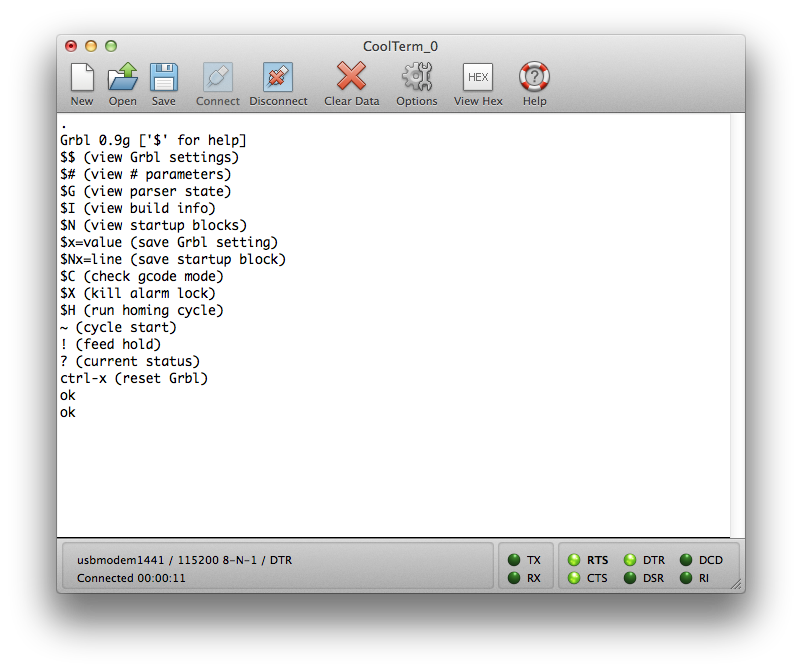 Ok, I grabbed the latest grbl sources from the grbl github, compiled and uploaded the hex file. Now I see this when I connect in CoolTerm and issue the $ command to get help: