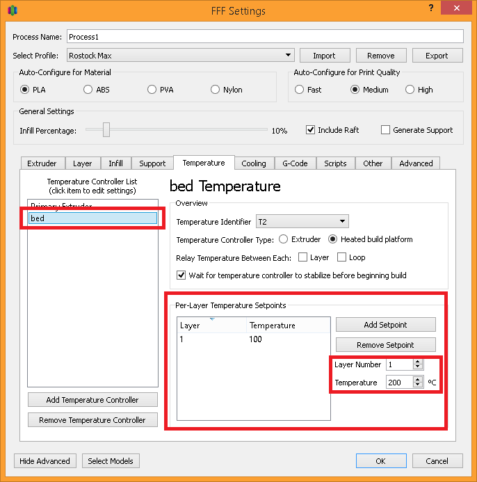 I am have a problem with setting the BED and Nozzle temperatures. I have set up to print PLA. No bed temp and nozzle temp @ 205. It starts out right but switches to ABS setting in just about 1 minute. 100 deg bed temp and nozzle @ 230. Can't figure out what I am doing wrong. Any suggestions would be appreciated.