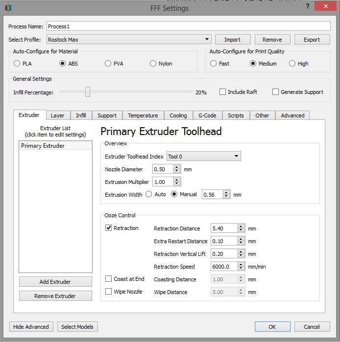 Pdegior wrote:I've had my Rostock Max for a couple of months. It's the first printer I've owned and am quite pleased with it. I purchased Simplify3D a few days ago and at first I was very impressed. It is by far the fastest slicer I've tried. Overall I love all of the features it offers. However, like quite a few others I've been having trouble with gaps between my perimeters and infill. I've played with all sorts of settings and haven't been able to figure it out. I thought I had calibration issues and spent many hours printing and measuring etc. I went back and printed a small object with Simplify3d and then Slic3r. Slic3r had no gaps ( well maybe one small one that was barely visible). Simplify3D leaves gaps all over the place. I tried to match the settings from Slic3r as close as I can to no avail. So, my conclusion is that it must be in the G-code (which I have not taken the time to study) .Maybe someone smarter than me can figure it out, because I seem to be failing. I truly want it to get it figured out because I really like so much about it. But, if I cant produce quality prints, then I will have to use Slic3r and patiently wait for it to slice.