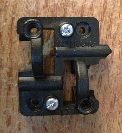 The flipped guide block has “USA” on the left and “SEEMECNC” on the right, which is upside down from how it was originally, or supposed to be, installed. The aluminum tubing is 1/8 x .014 in. from a hardware store, and is approximately 27mm long. The upper end is angled to a point in order to fit as close to the wheels as possible. I suspect you could make it just touch the wheels on both sides and the soft aluminum would quickly wear into the right clearance. The tube extends down through the guide block to the top of the large cylindrical aluminum fitting, and is wrapped with a layer of electrical tape to keep it tightly sandwiched in the guide block. The guide block on that side has a pathway slightly larger than the diameter of the tube.
