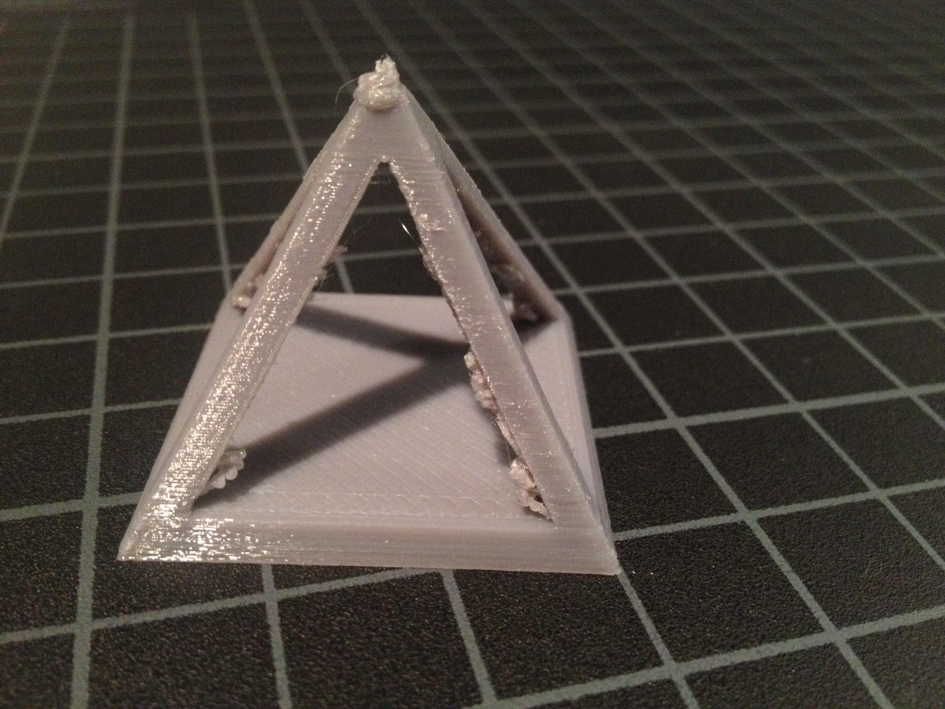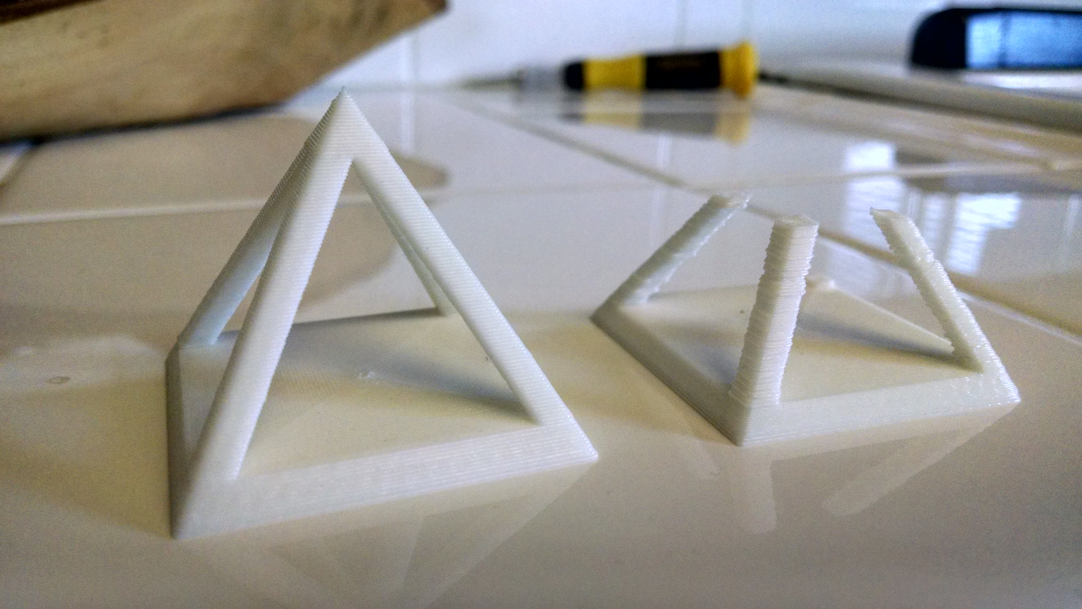 So I'm about a month and a half into printing on my Rostock V2( E3D v6 hotend .4mm nozzle, TrickLaser CF arms), and I've had great results with ABS so far. I started using PLA this week, and as I did with ABS, used the Hollow Pyramid to get a feel for it. After about 4 or 5 unsuccessful attempts( which I attribute greatly to the Shaxon PLA that I impulse bought at Frys-its seriously 1.67-8 dia. on average and the first 5m was kinked and speckled with black, the first go looks like a geometric Dalmation) I landed with the one on the left: