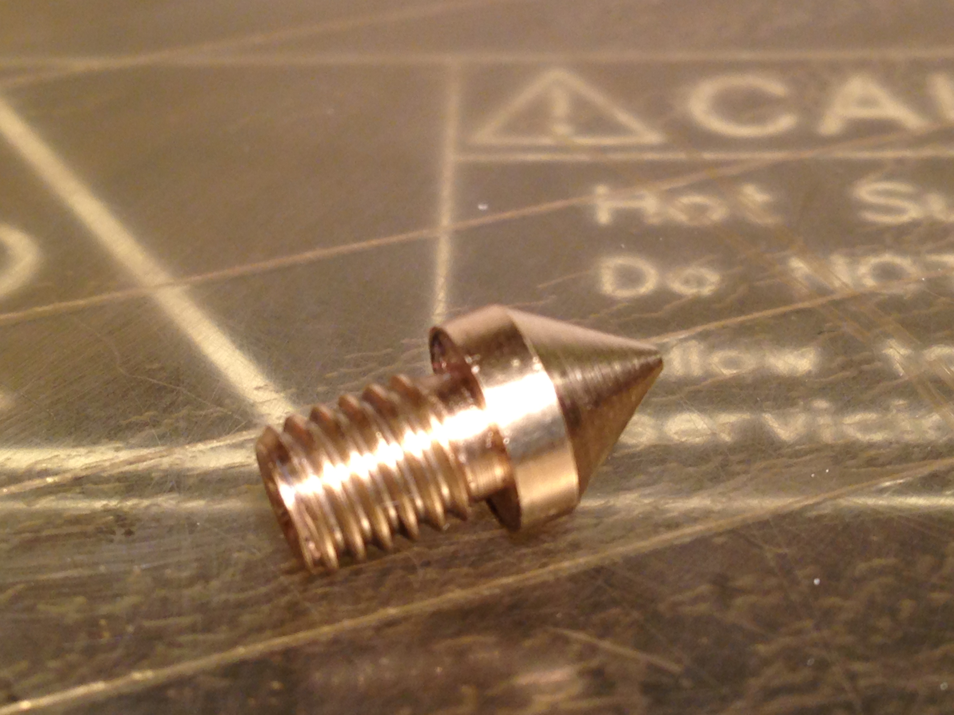 I don't know how well it will work with PLA (the angle of the bit I used to drill it out was a standard 118 degree 2mm bit, so its a pretty sharp transition from 1.75 to .36), or how well it will work in general. I'm hoping I'll get some pretty nice surface finishes out of it, I've said before a little bit about my theories on nozzle design performance and quality (sharper the point the better the finish, but if its taken to extremes (the Merlin hotend) it can impact performance). This is assuming the internal angle (transition angle? I don't know proper terminology) is pretty close (if not) the same as the outer angle. More simply put, the sharper the point of the outside, the better the surface finish, and the sharper the angle on the inside, generally the better performance. This is all by observation of the different hotends I've used, and the different prints I've gotten from them and from what I've seen of other's prints.