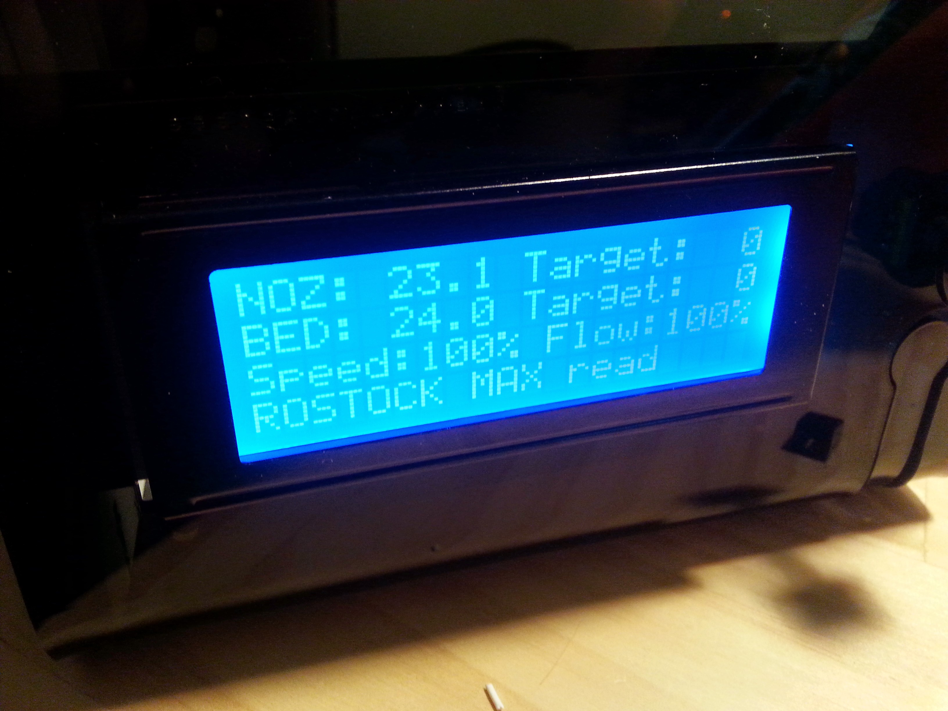 The thermistors both were reporting ~23C, but when I tried to turn the heat up (or on) the control panel shut down. This was true if I did it on the max lcd panel or thru Mattercontrol. The bed heat led will not come on. I pulled the bed and there were no wiring issues, bridges, shorts, or broken connections. I checked all the plug in & screw in connections on the rambo board but the issue persists. Again this issue is true of both the hot end and bed heat. All fuses were checked several times and are good to go. Again, no amount of force, wiggling, or jiggling could make these connections work.