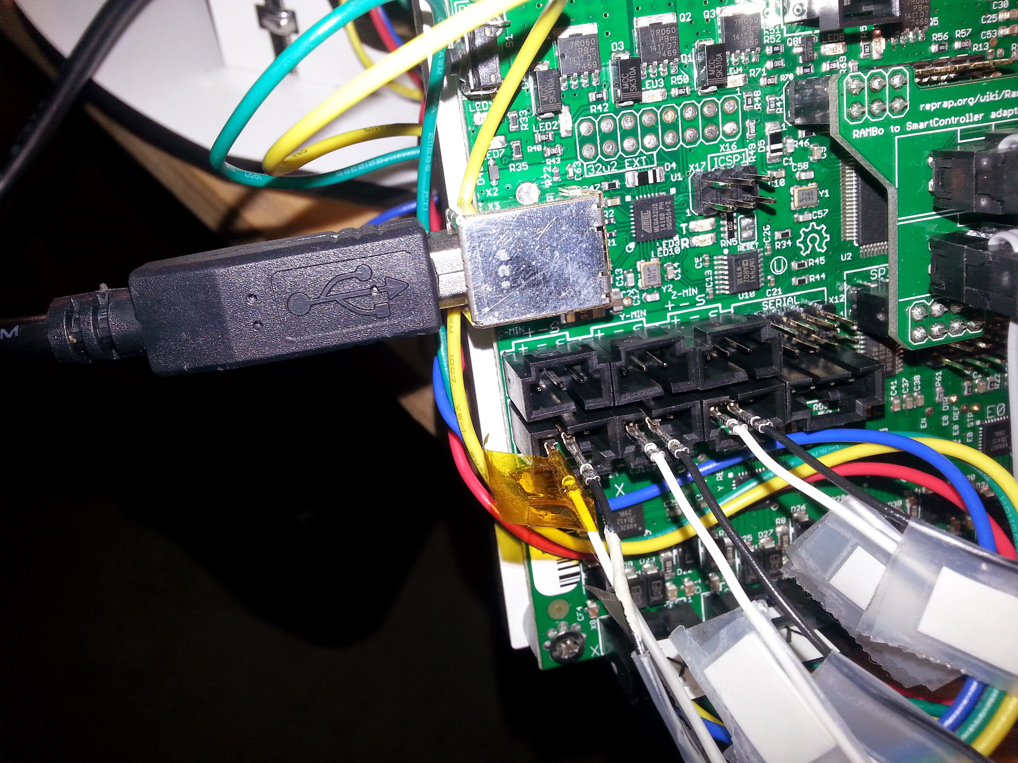 The thermistors both were reporting ~23C, but when I tried to turn the heat up (or on) the control panel shut down. This was true if I did it on the max lcd panel or thru Mattercontrol. The bed heat led will not come on. I pulled the bed and there were no wiring issues, bridges, shorts, or broken connections. I checked all the plug in & screw in connections on the rambo board but the issue persists. Again this issue is true of both the hot end and bed heat. All fuses were checked several times and are good to go. Again, no amount of force, wiggling, or jiggling could make these connections work.