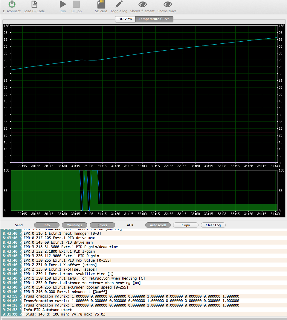 When I do the hot end pid autotune it goes fine. When I do the bed autotune it gets to the target temperature, prints out the bias, d, min, and max, then it starts heating the bed again, and just sends the temperature of the bed through the roof. The hottest I let it go, just to see what happened, was 100 deg. I am using a SSR and a 24v power supply. The software looks like it is only powering the bed for 15 or so percent of the time, but the SSR is on solid. I would expect the SSR to blink quickly.