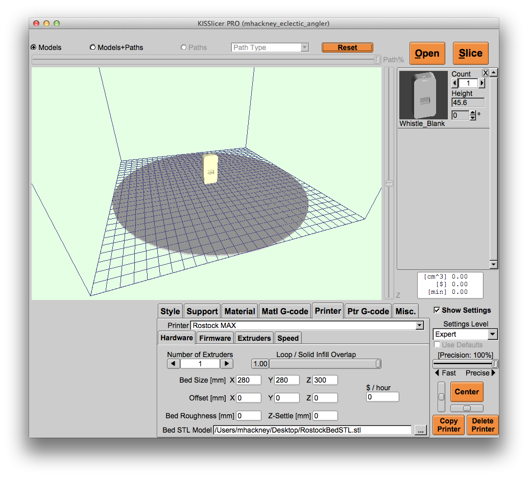 For those of you using KISS, it has a feature to import the printer's bed as an STL. I've created one for our beloved Rostock. It is 280mm diameter and 2mm thick with its top surface at z=0 so items sit on it properly. Set your bed size to 280mm x 280mm and load this STL. It helps laying out multiple parts and sizing things.