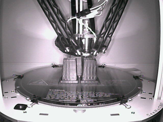 Here's a snapshot of an in-progress print. You can see it most clearly on the right-hand part - long, vertical triangles on what should be a smooth surface.