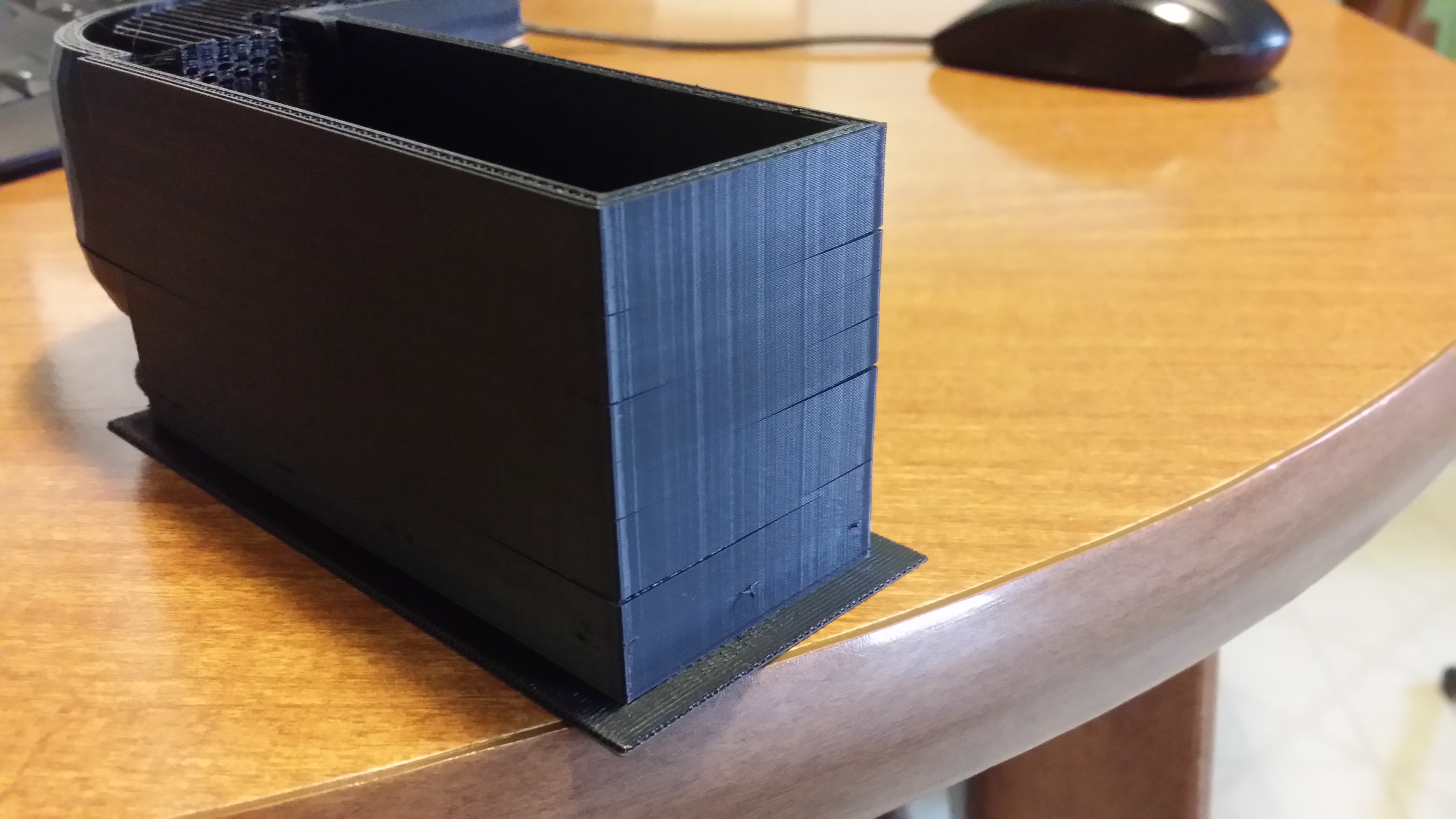 I'm a new Rostock Max v2 owner and so far I've done a few small ABS prints with no troubles so I decided to start one of my larger prints. These are parts for a car mod that I'm doing. Well I got major delamination. What do you guys think might cause this, or help it rather? I was printing at 225c nozzle / 90c bed. I do not have an enclosure around my printer but other folks tell me they can print ABS "OK" without an enclosure. Ambient room temp is in the mid-70's with no breezes or anything. I sliced the part with the Cura slicer that's built in to Repetier Host, using a config file that I got here from the forums. I checked and the Cura config was about the same as the Rostock Max MatterControl config that you can download from SeeMeCNC. So I'm open to suggestions!?