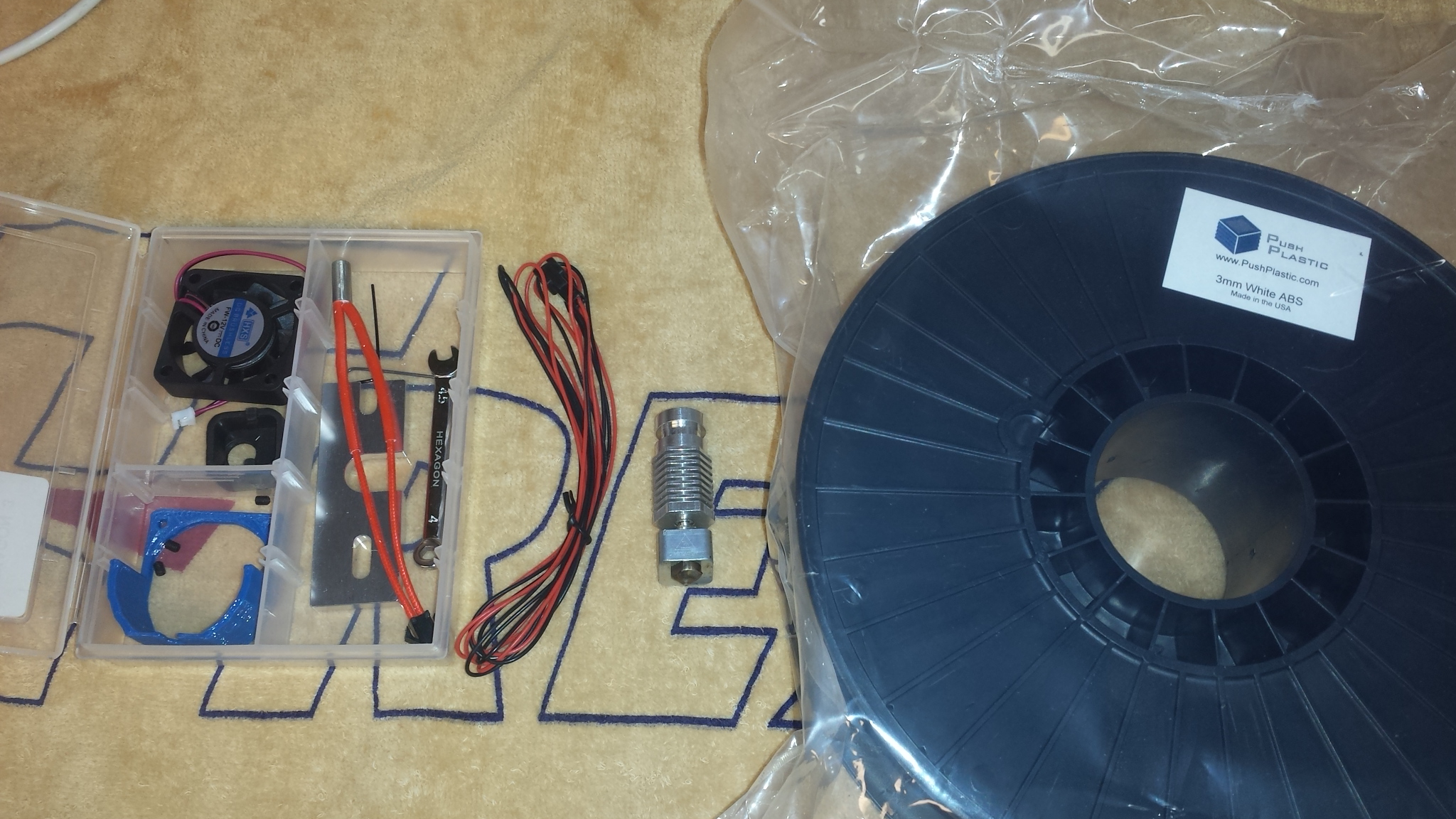 Up for sale is my spare Hexagon Hotend that uses 3.0mm filament. Includes everything pictured. The hotend has seen very little use. You will need a new thermistor and wiring for the heating coil(had to use on my current printer). Also included is a brand new roll of 3.0mm Push Plastic ABS White. Both together new is 100 before shipping. Looking to get 70 shipped for everything. Any questions feel free to ask.